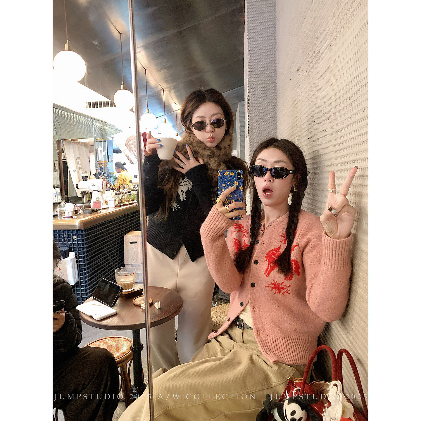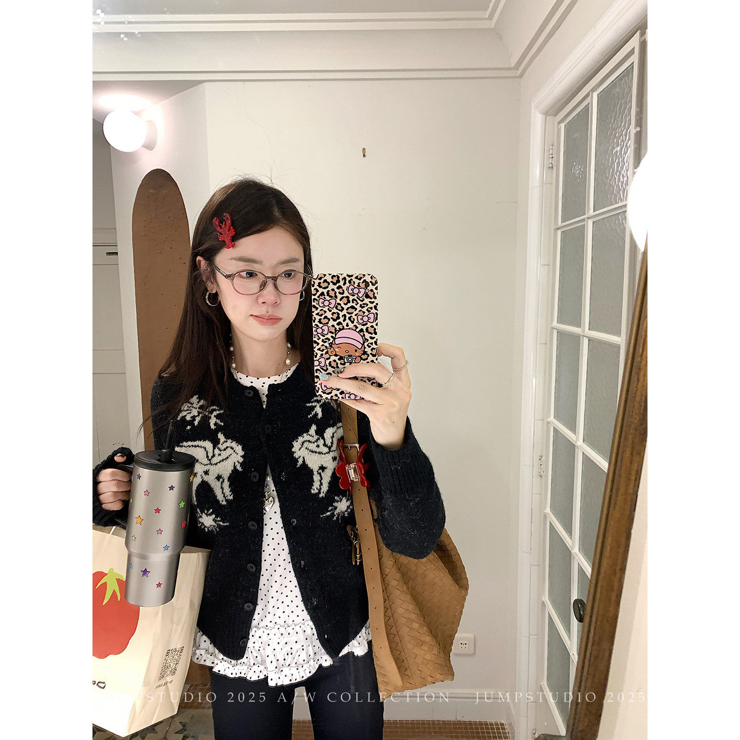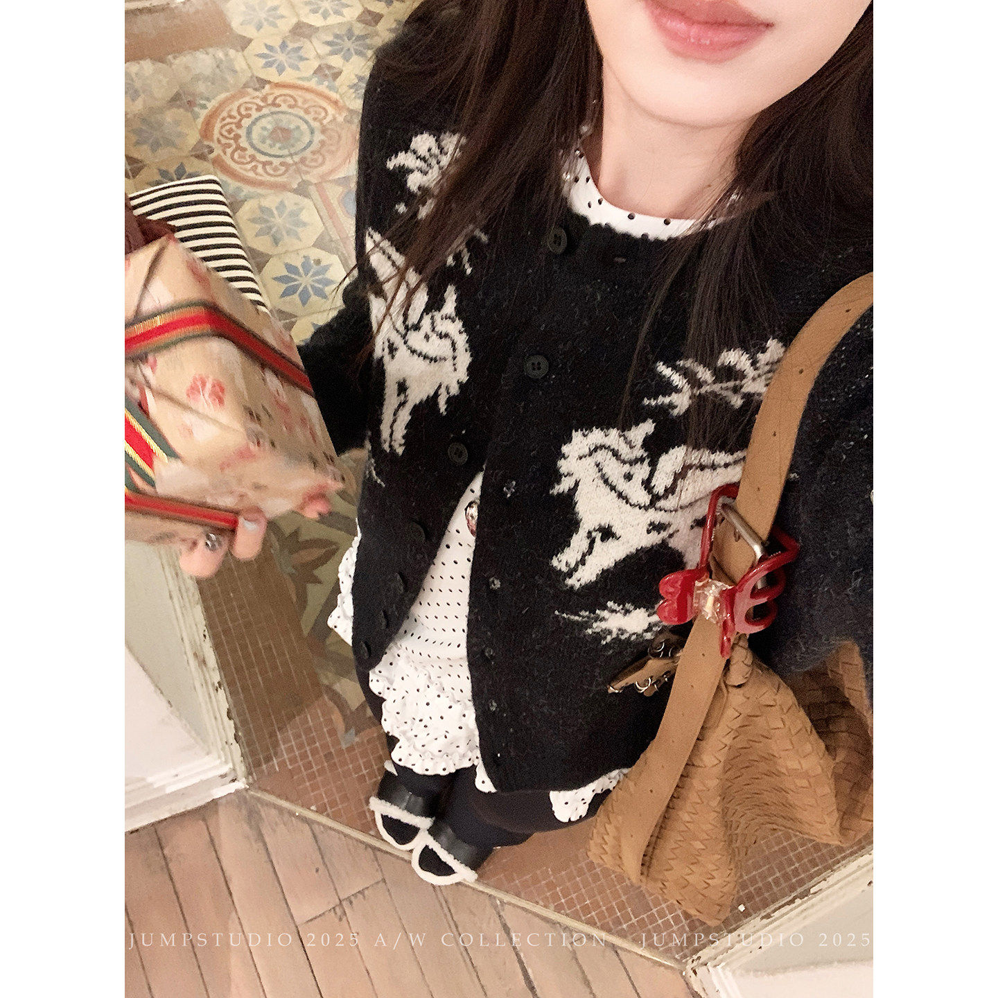 草莓跳 复古圣诞小马提花圆领针织开衫女冬季宽松慵懒毛衣外套