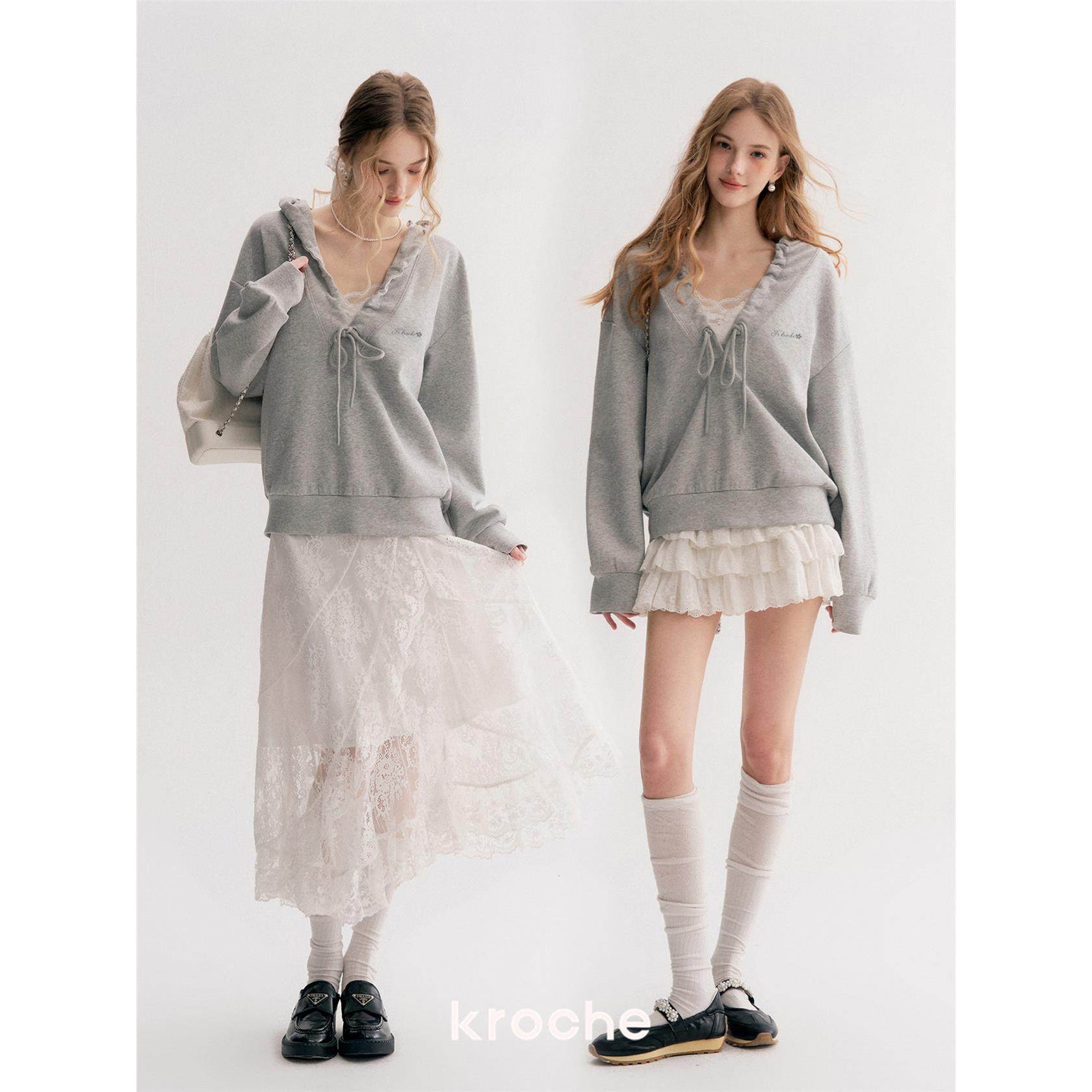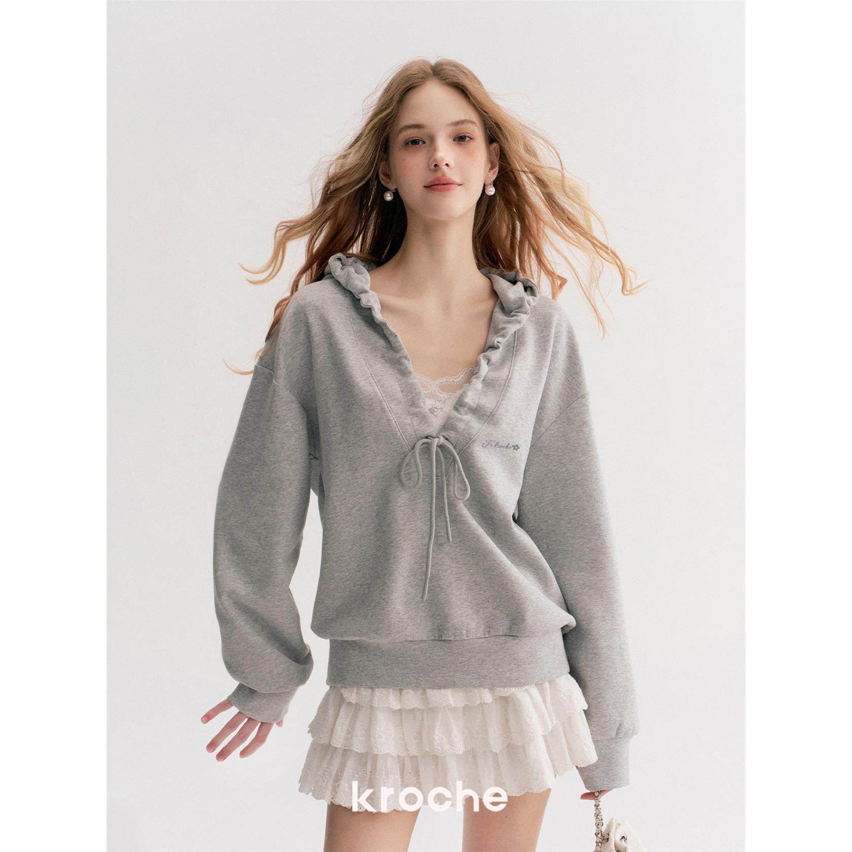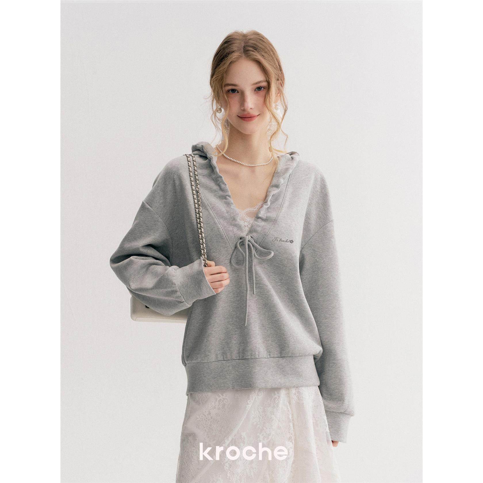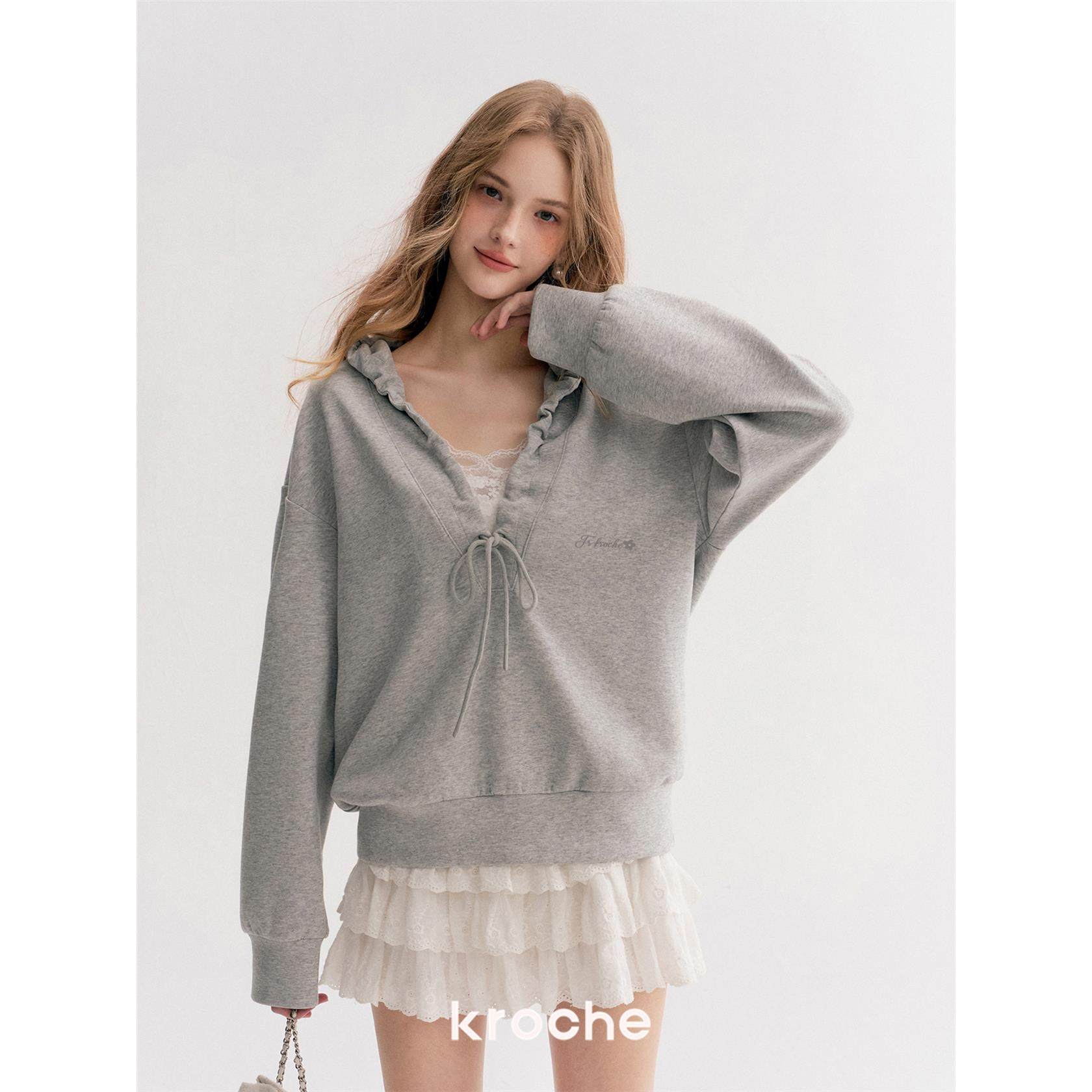 Kroche 25aw Balletcore 褶皱抽绳 棉感空气层宽松大V领连帽卫衣