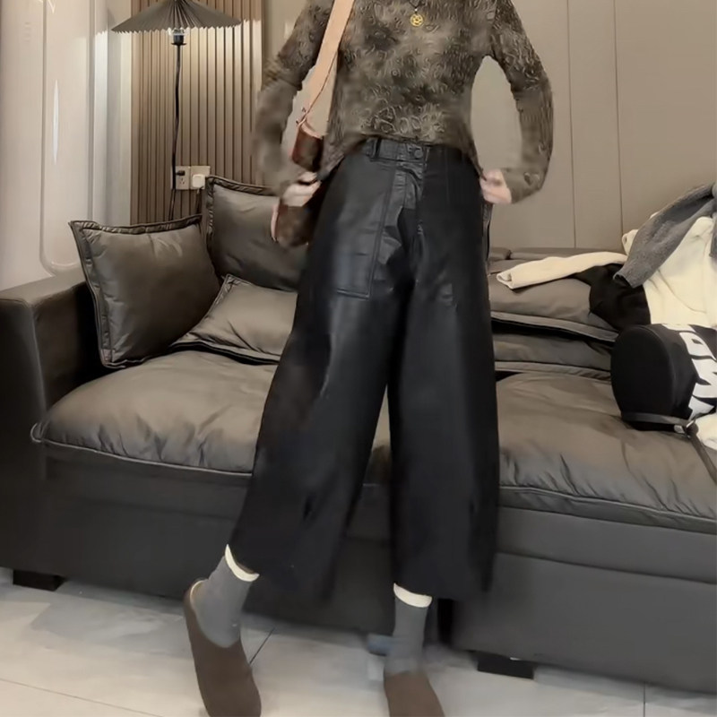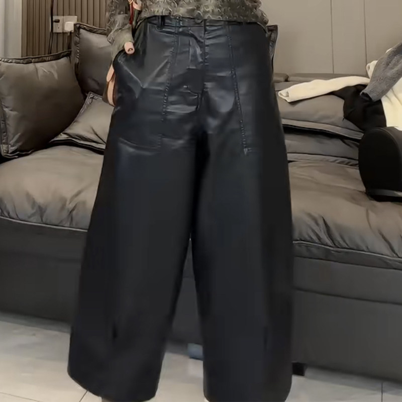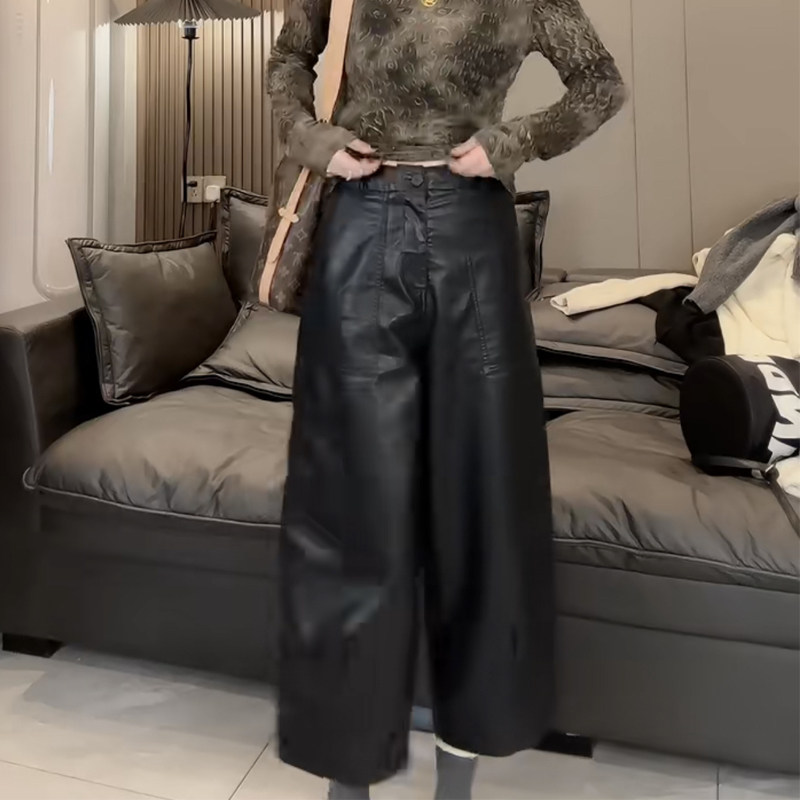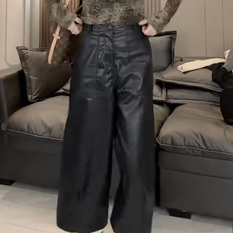 2025年秋冬新款黑色PU皮阔腿裤女高腰显瘦宽松洋气欧货九分直筒裤