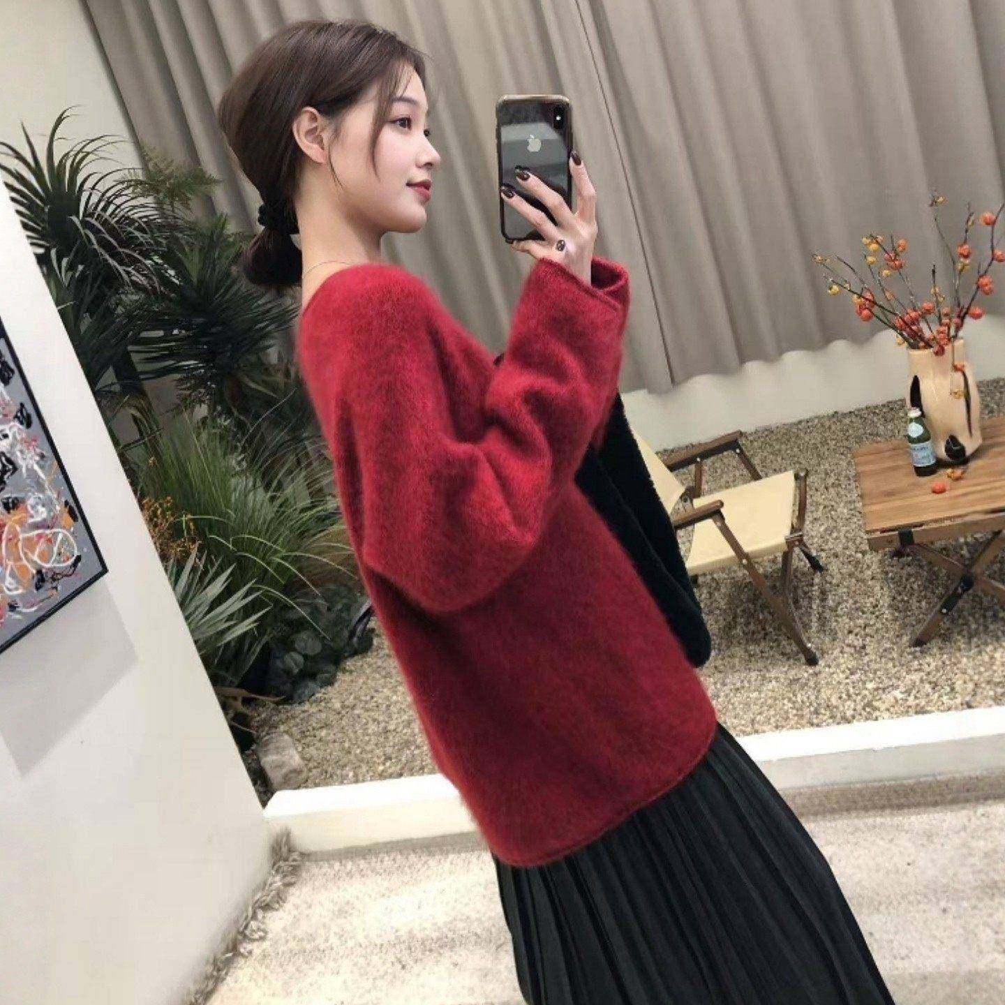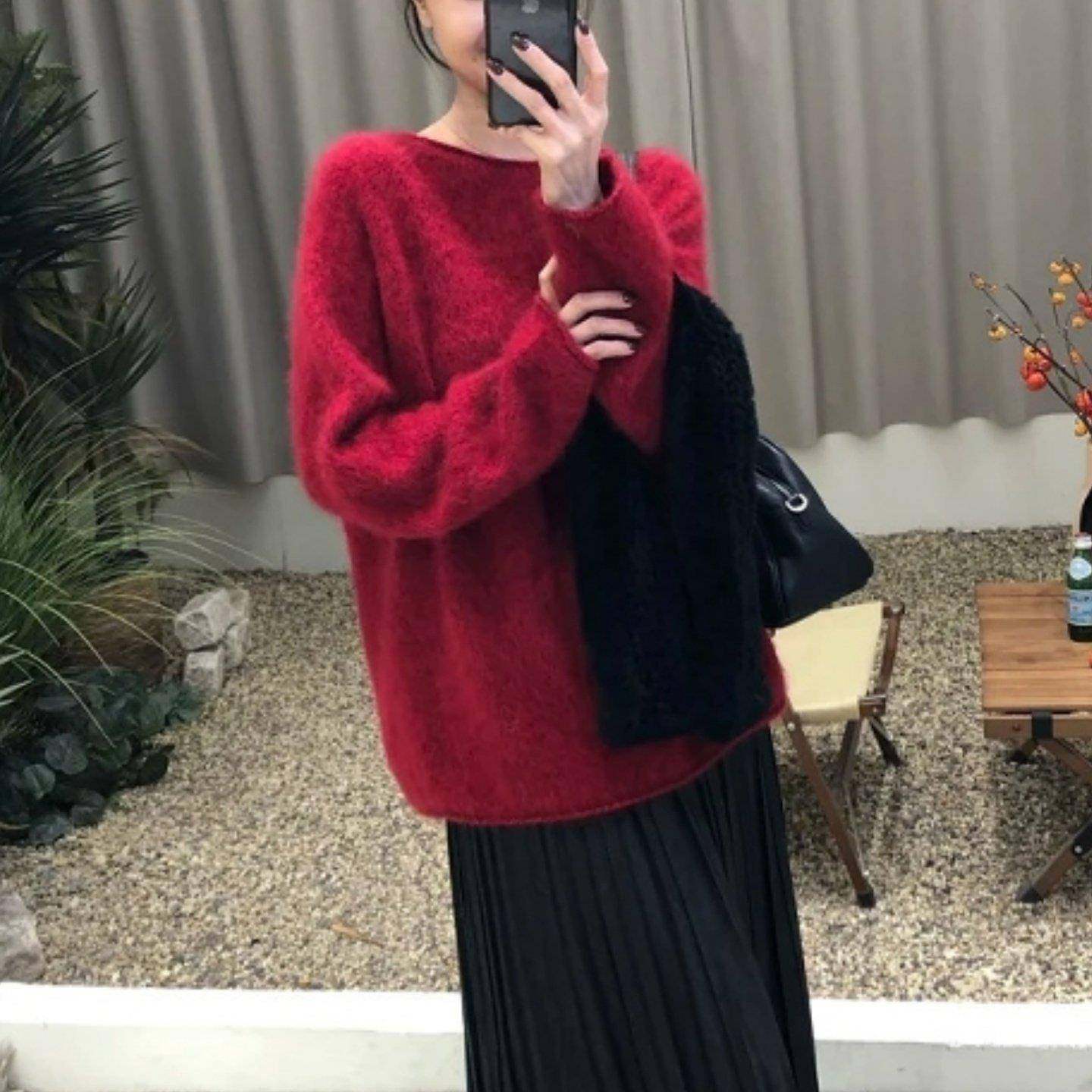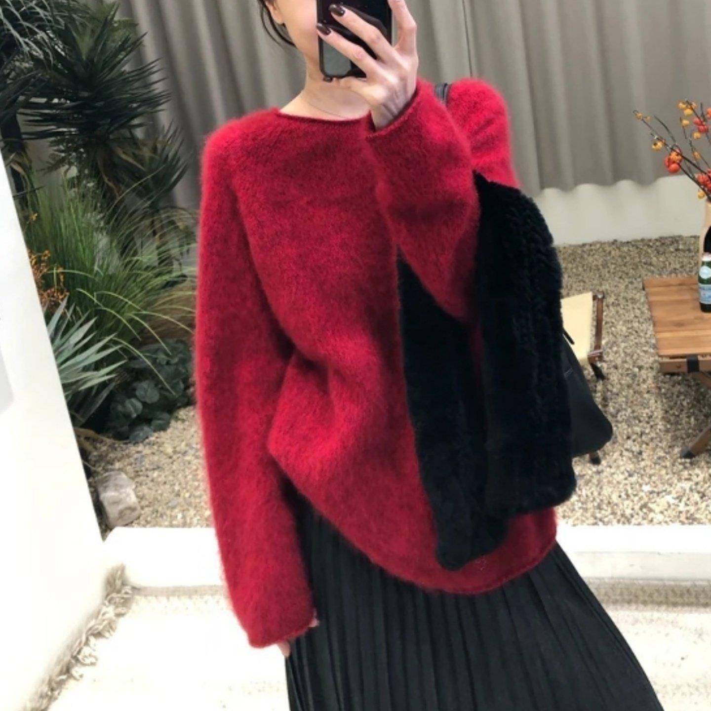 首页> 女装> 香港红色圆领套头绒感毛衣女2025冬新款大码宽松高级感显瘦针织衫