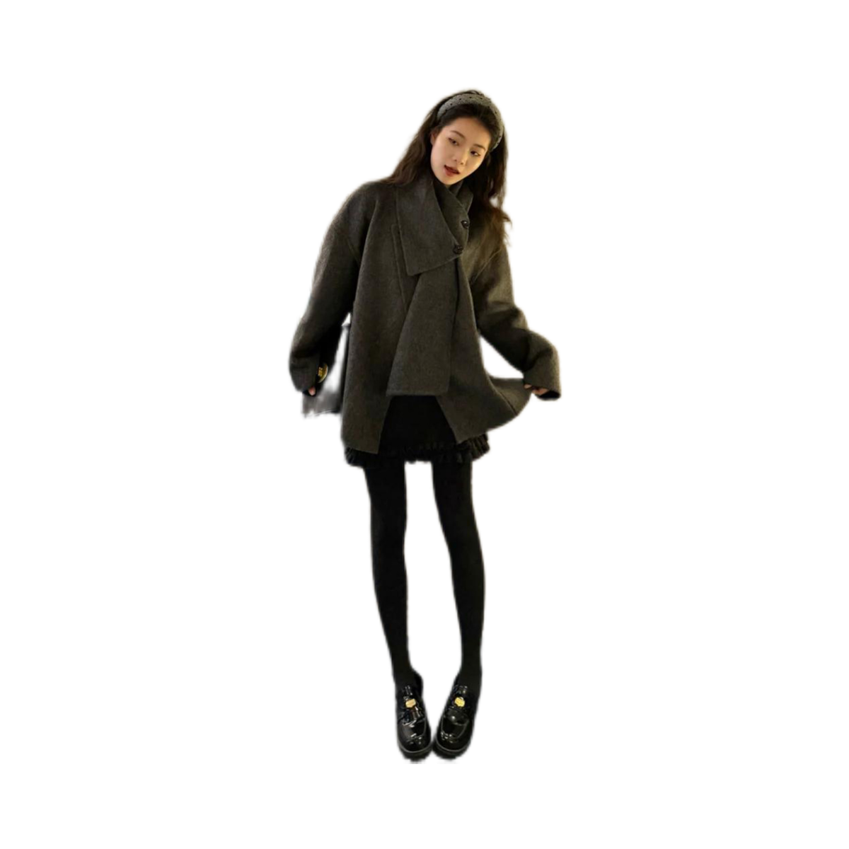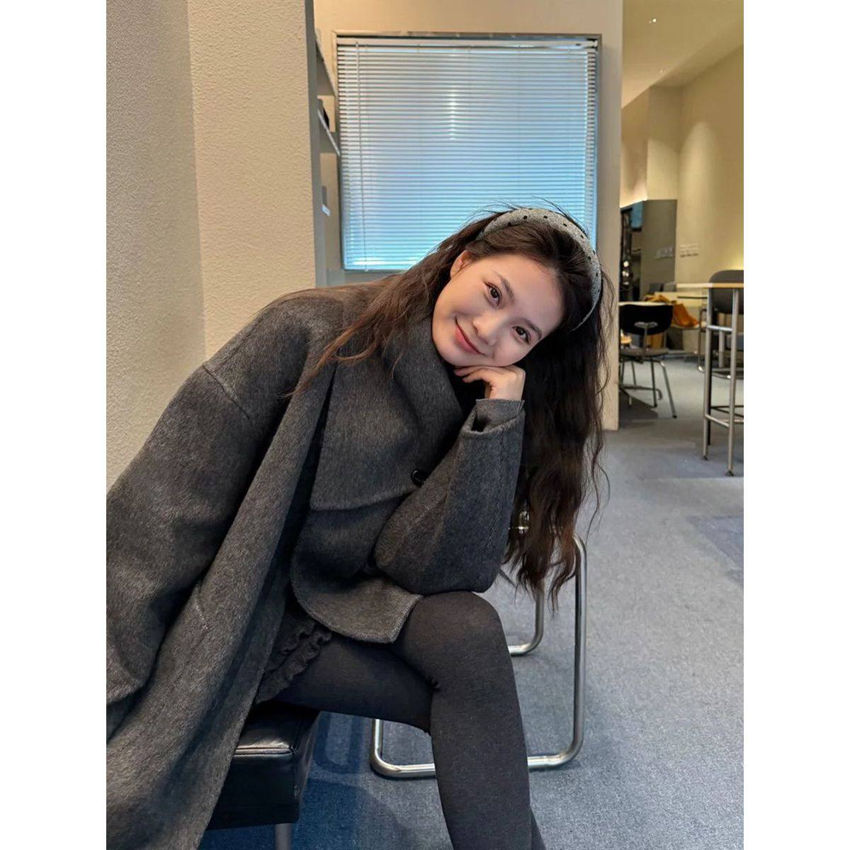 富家千金感灰色围巾领毛呢外套冬季小众气质高级感百搭呢子大衣女
