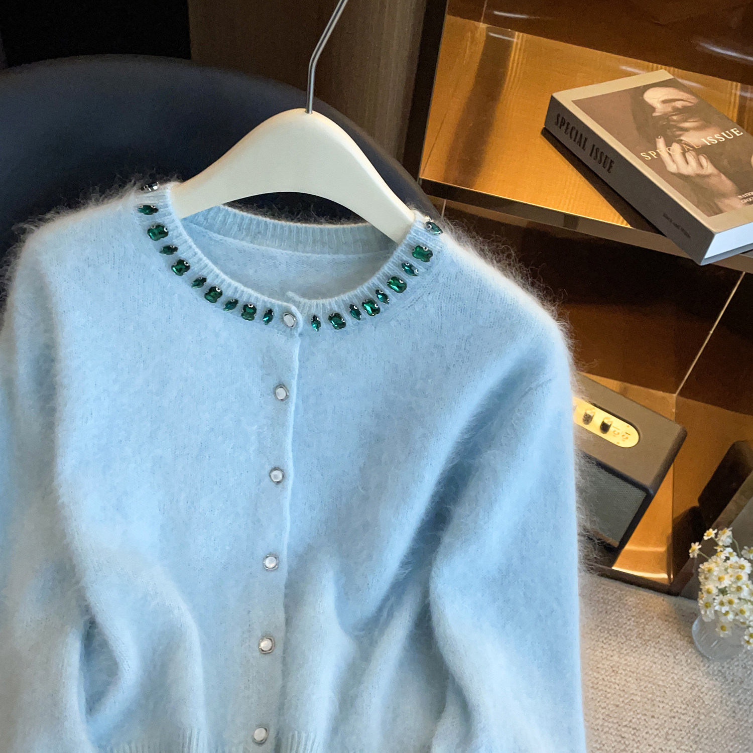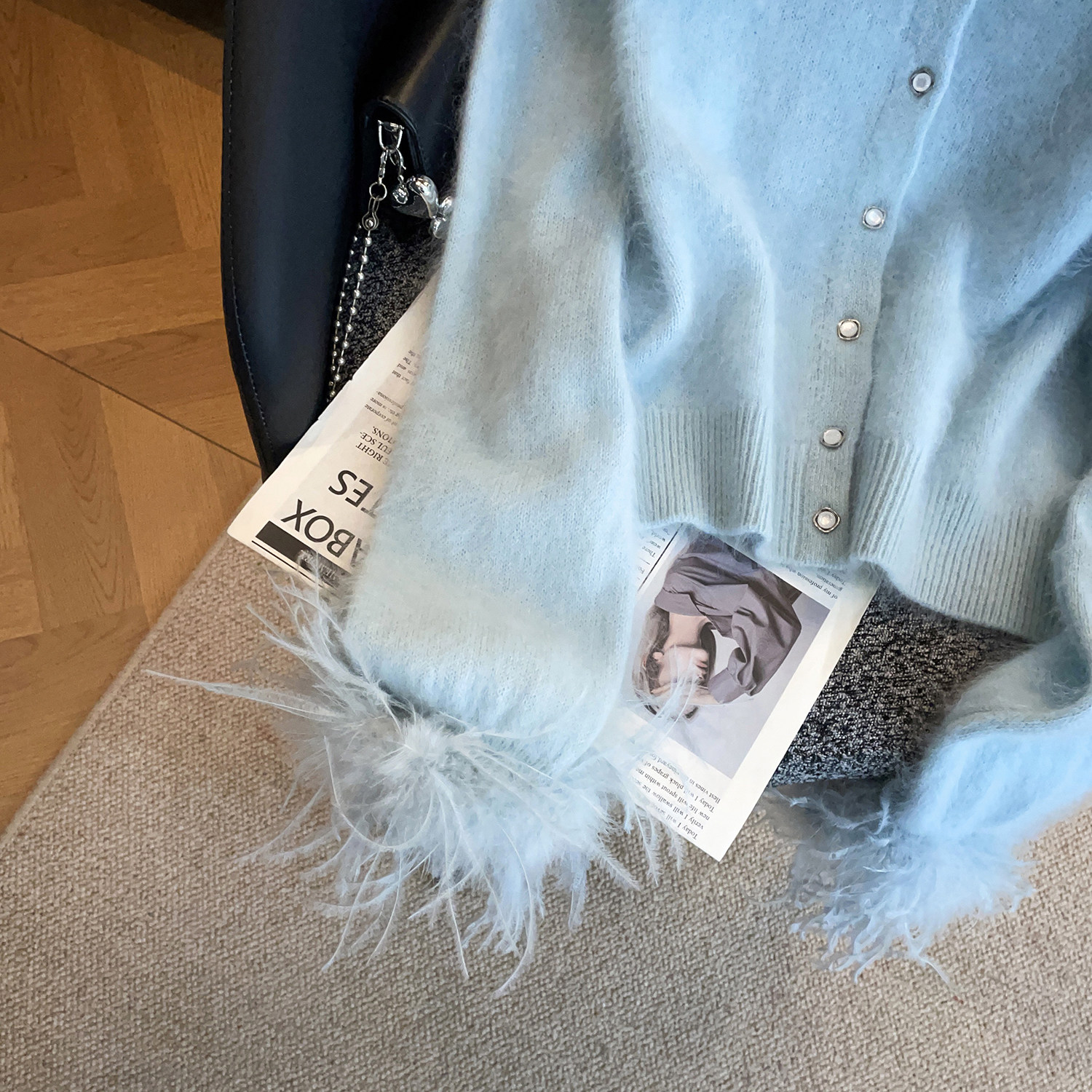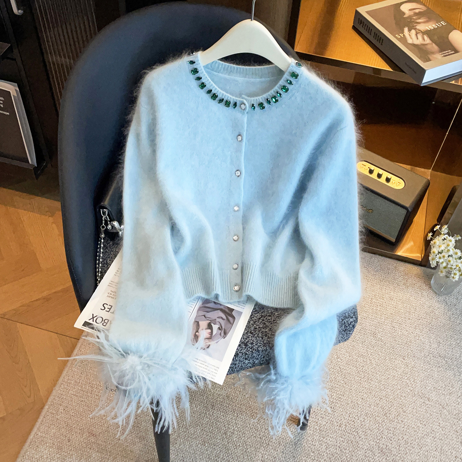 深圳南油高端女装2026春季新款千金风烫钻羽毛袖圆领毛针织开衫女
