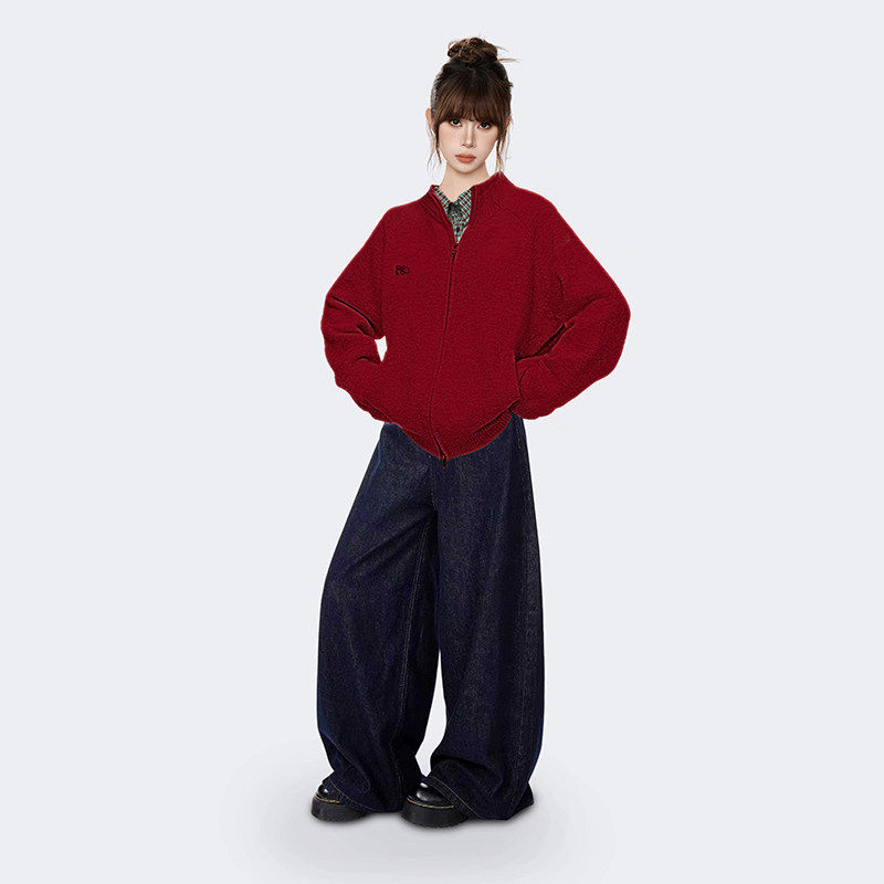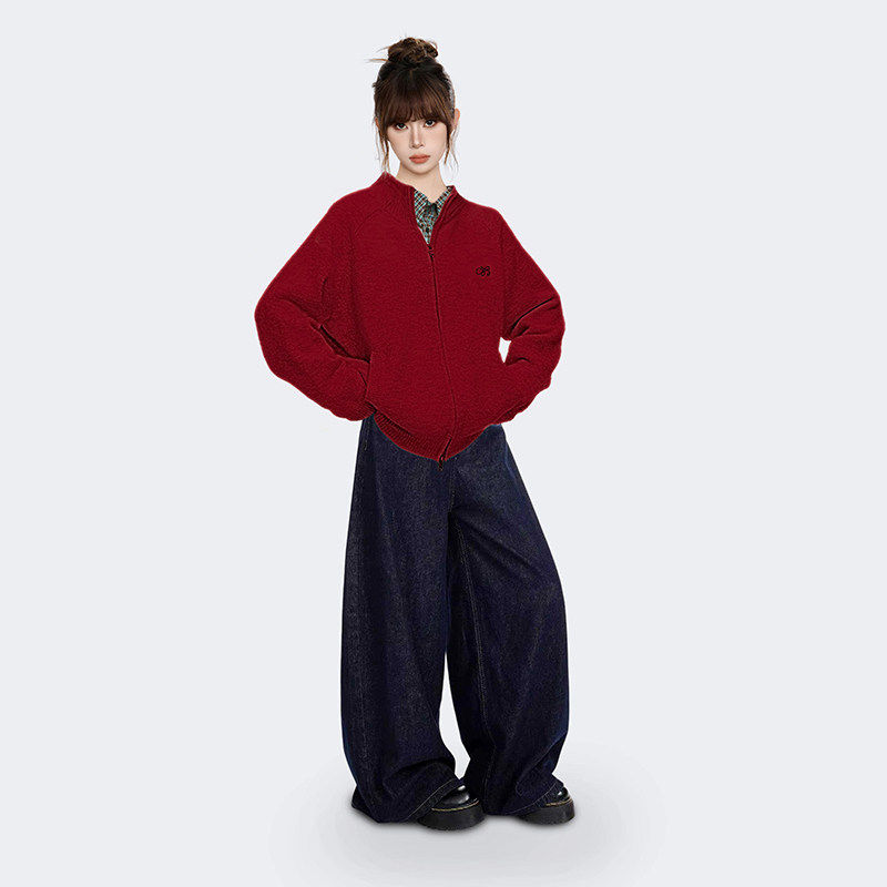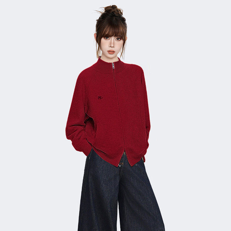 新年红色立领高领毛衣外套女秋冬冬季加厚高级感针织开衫拉链上衣