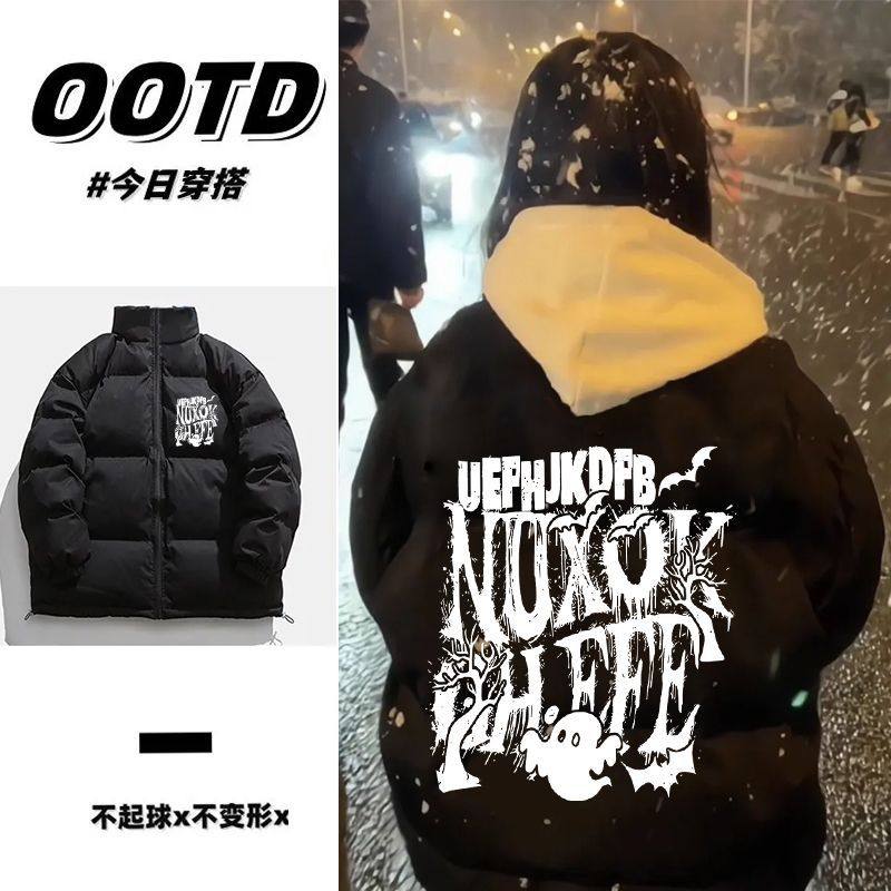 美式复古潮牌秋冬季痞帅印花立领棉服男女加厚保暖防风情侣面包服