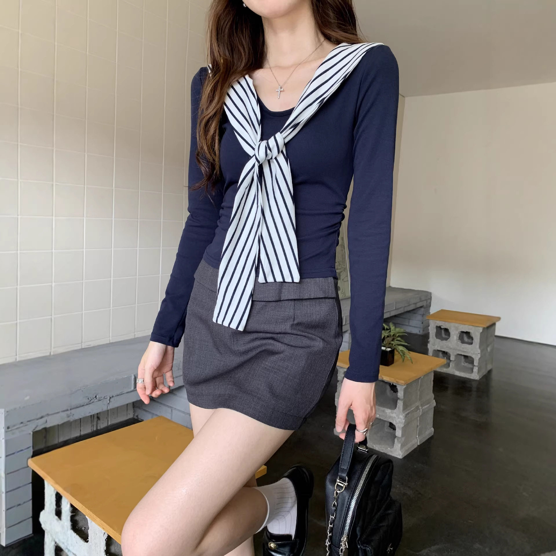 学院风假两件条纹系带披肩打底衫女春季韩系纯棉修身显瘦T恤上衣