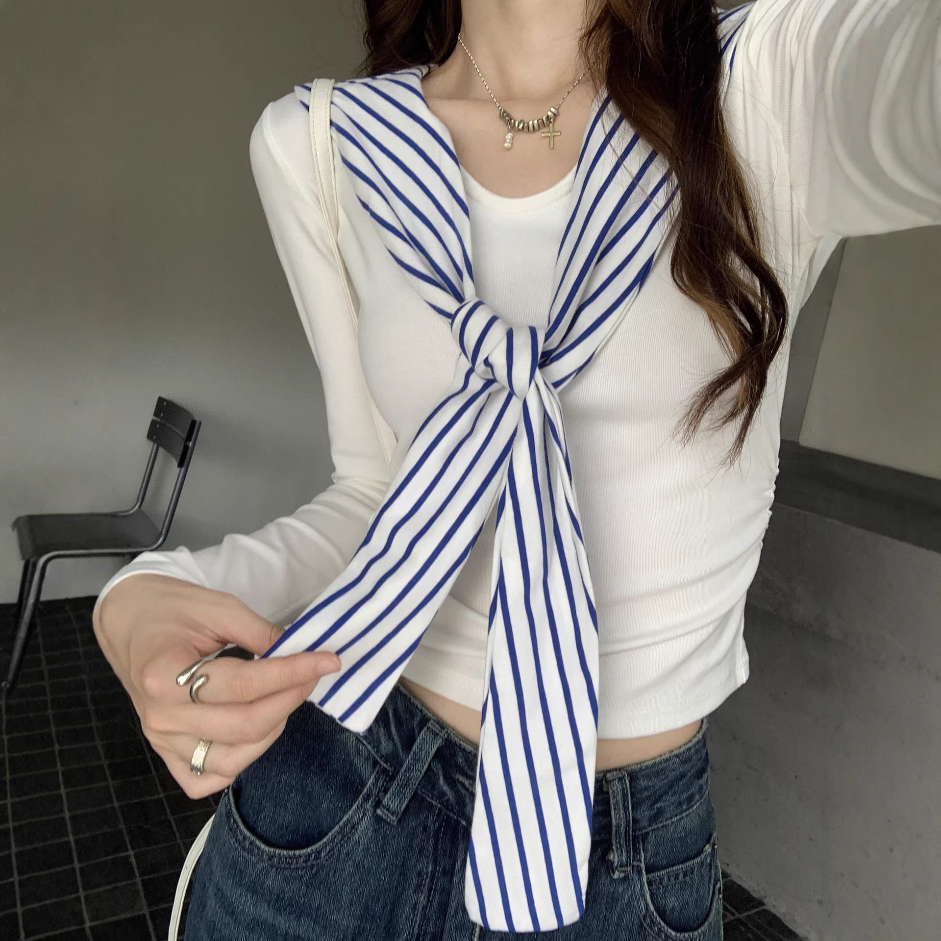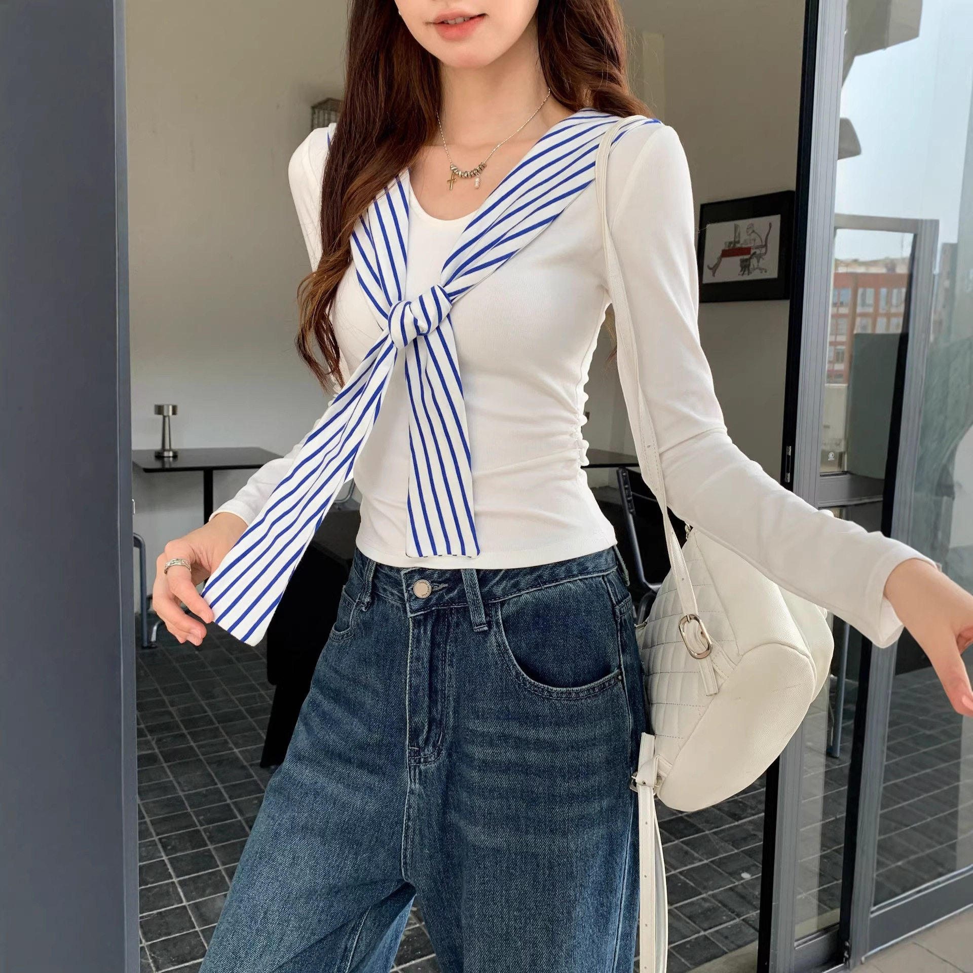 首页> 女装> 学院风假两件条纹系带披肩打底衫女春季韩系纯棉修身显瘦T恤上衣