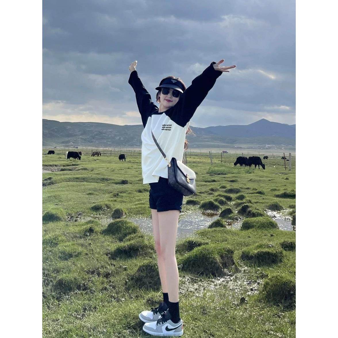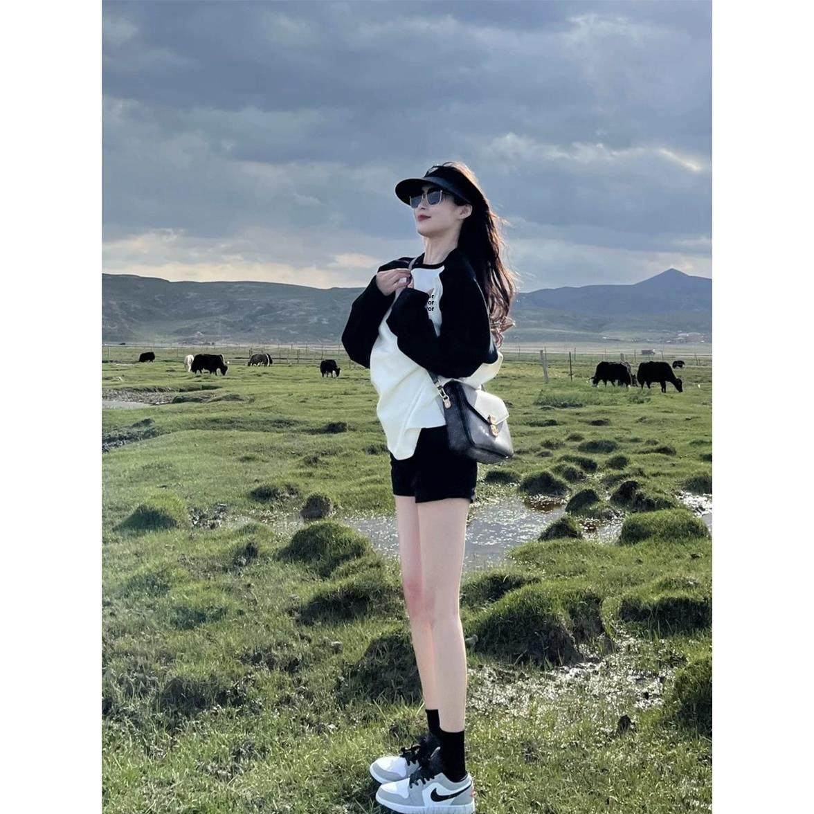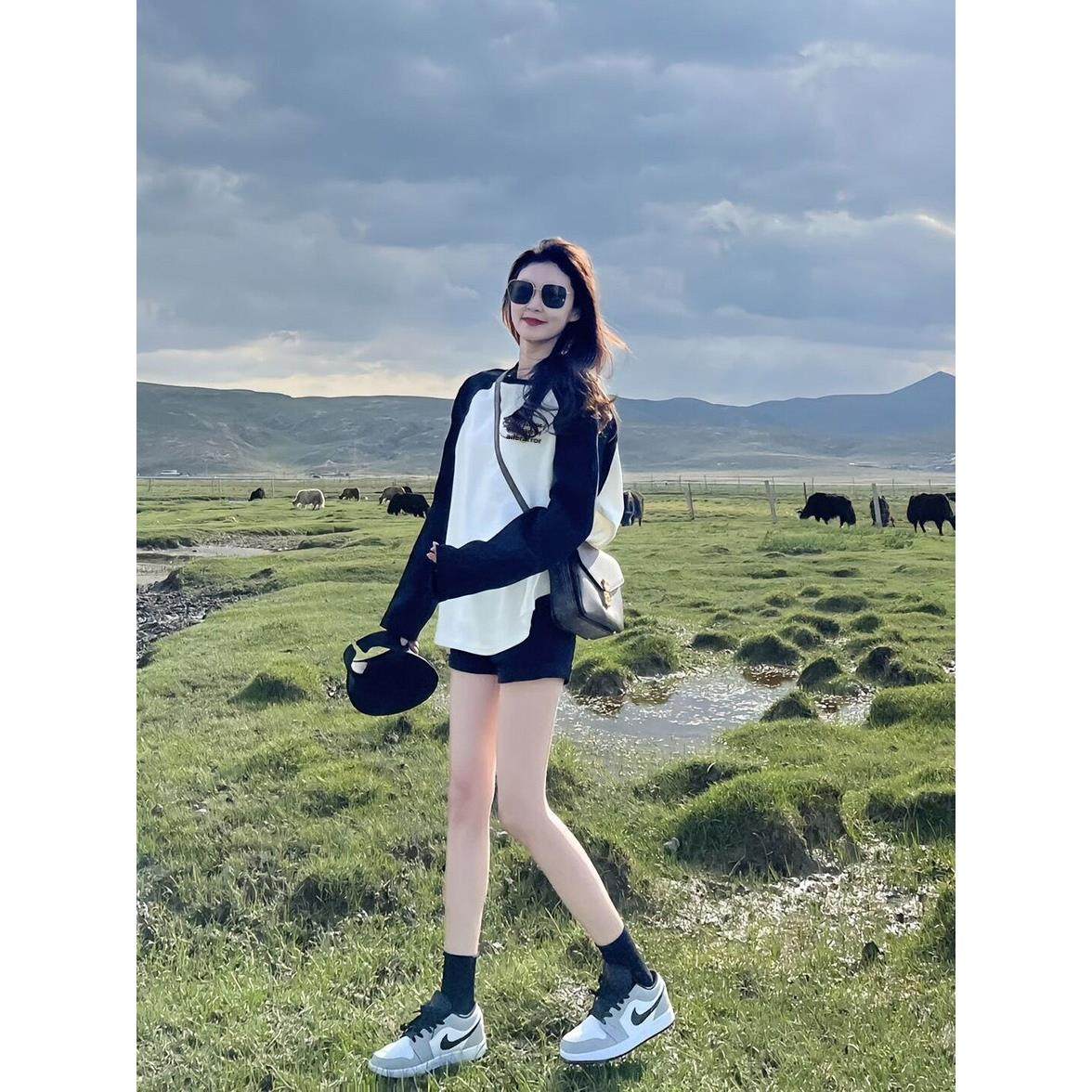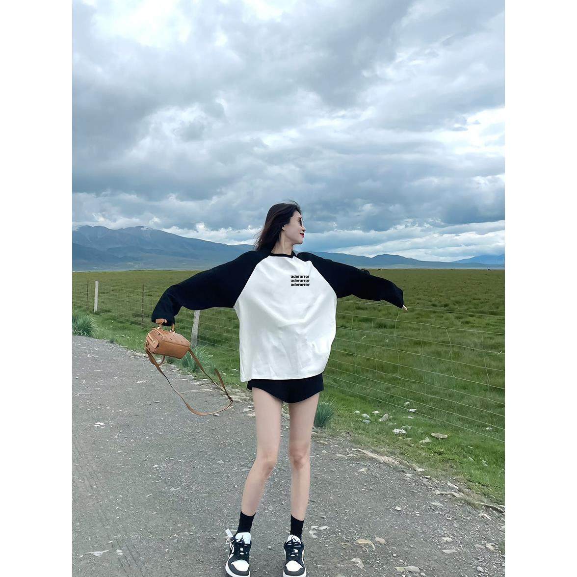 IT UNDER GARDEN 黑白插肩袖圆领长袖T恤女秋冬潮牌宽松休闲上衣