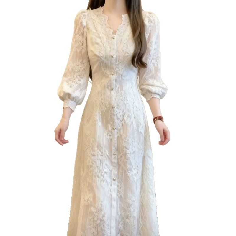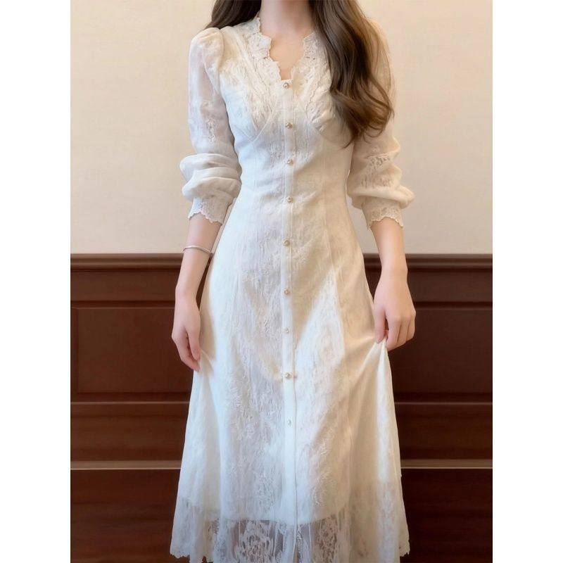 薄绒打底穿法式气质名媛领长袖连衣裙2025秋季蕾丝绝美收腰字长裙