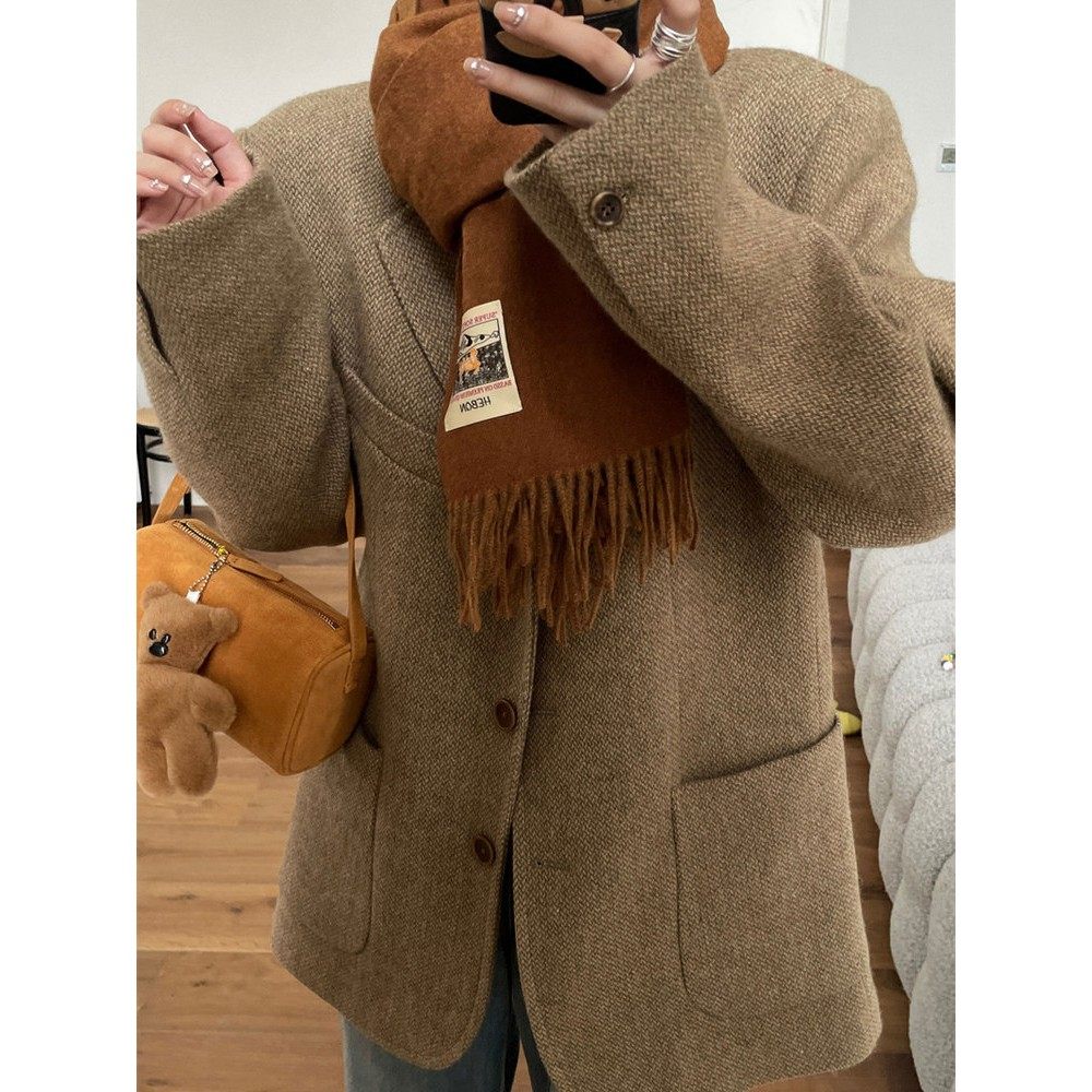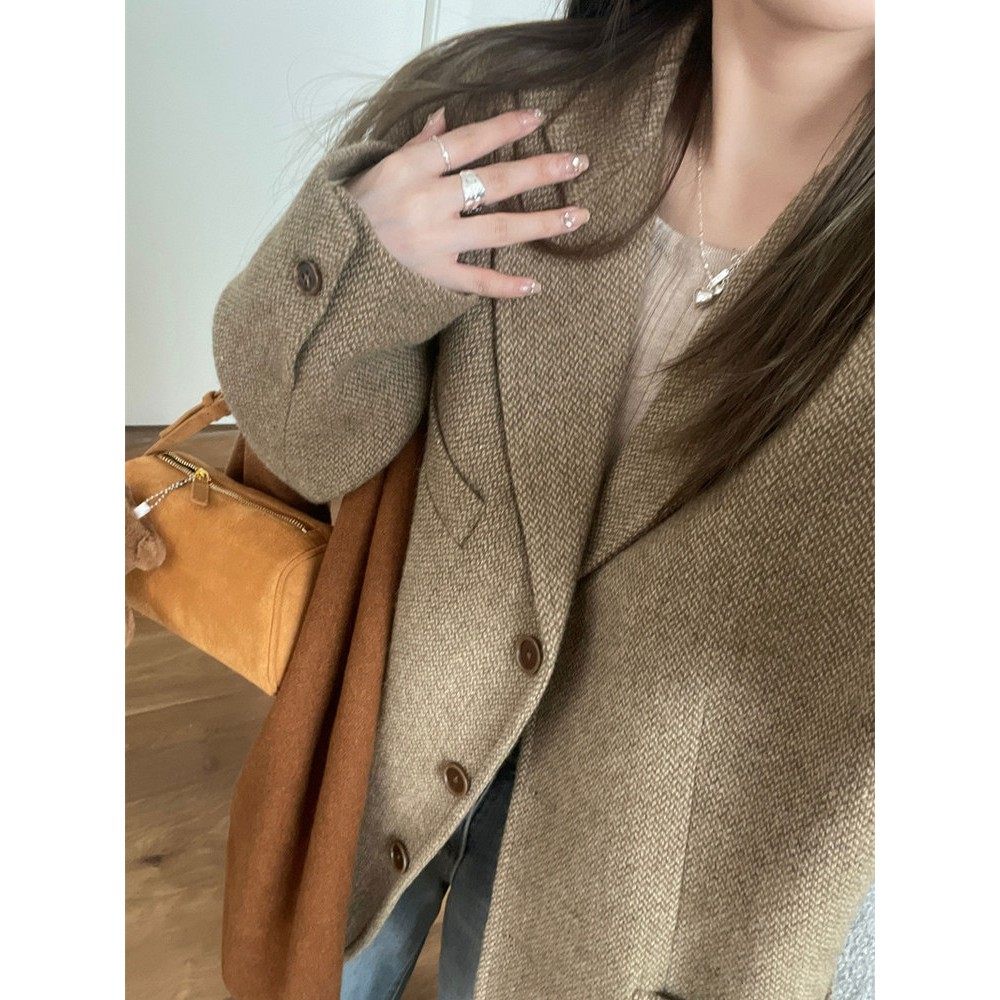 2025秋冬秋新款咖色羊毛呢小西装外套女小个子美拉德穿搭覆古上衣