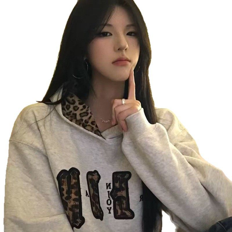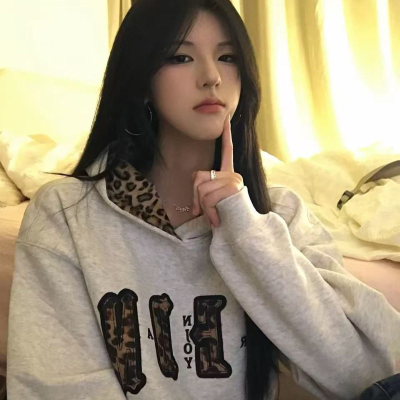 美式复古豹纹刺绣字母连帽卫衣女2025秋冬加绒加厚通勤上衣