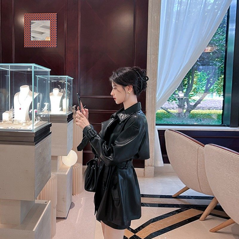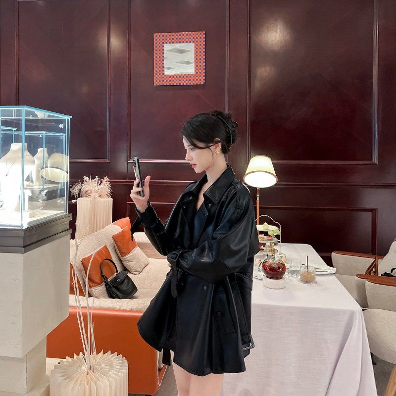 黑色pu皮风衣外套女2025春秋新款韩系高级感宽松休闲收腰气质大衣