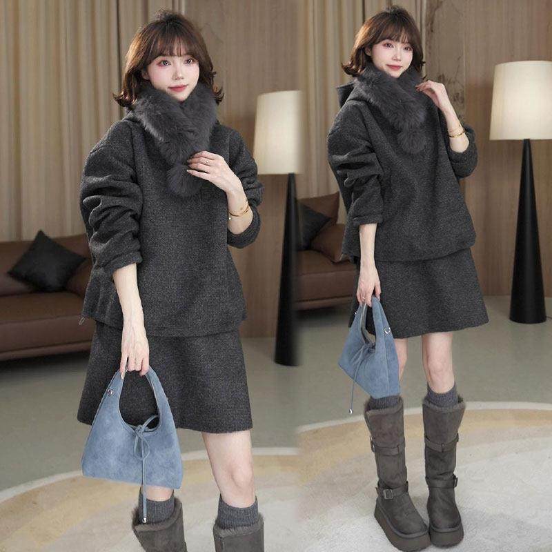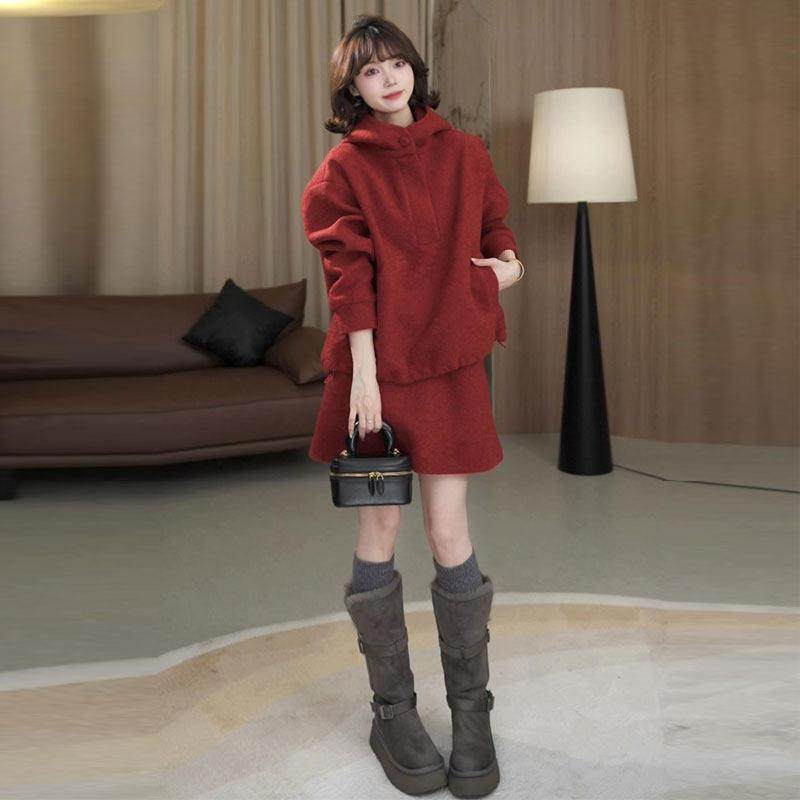 首页> 女装> 香港代购时尚套装女秋冬新款时髦加厚毛呢连帽卫衣半身裙两件套潮