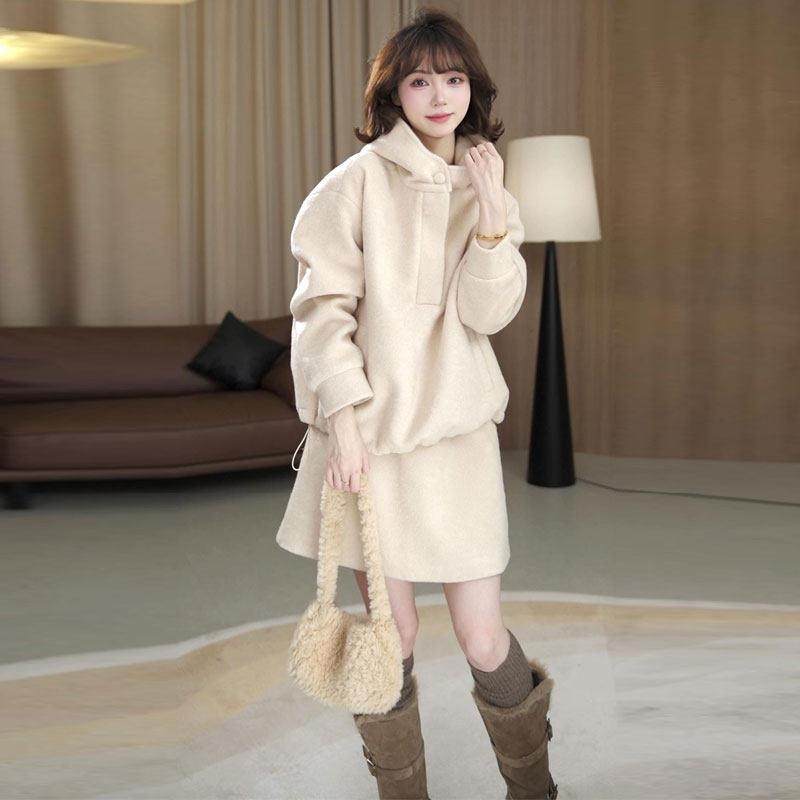 香港代购时尚套装女秋冬新款时髦加厚毛呢连帽卫衣半身裙两件套潮