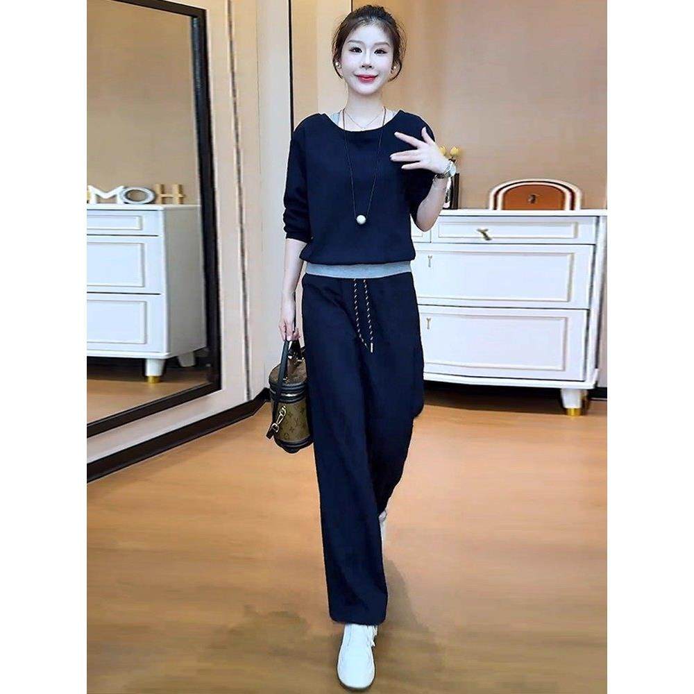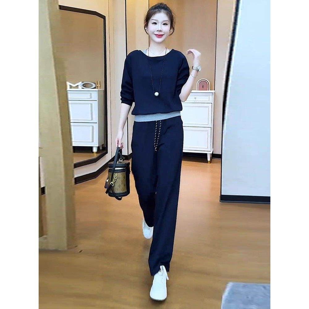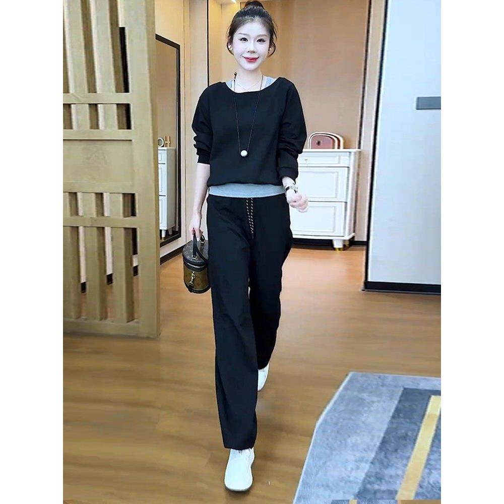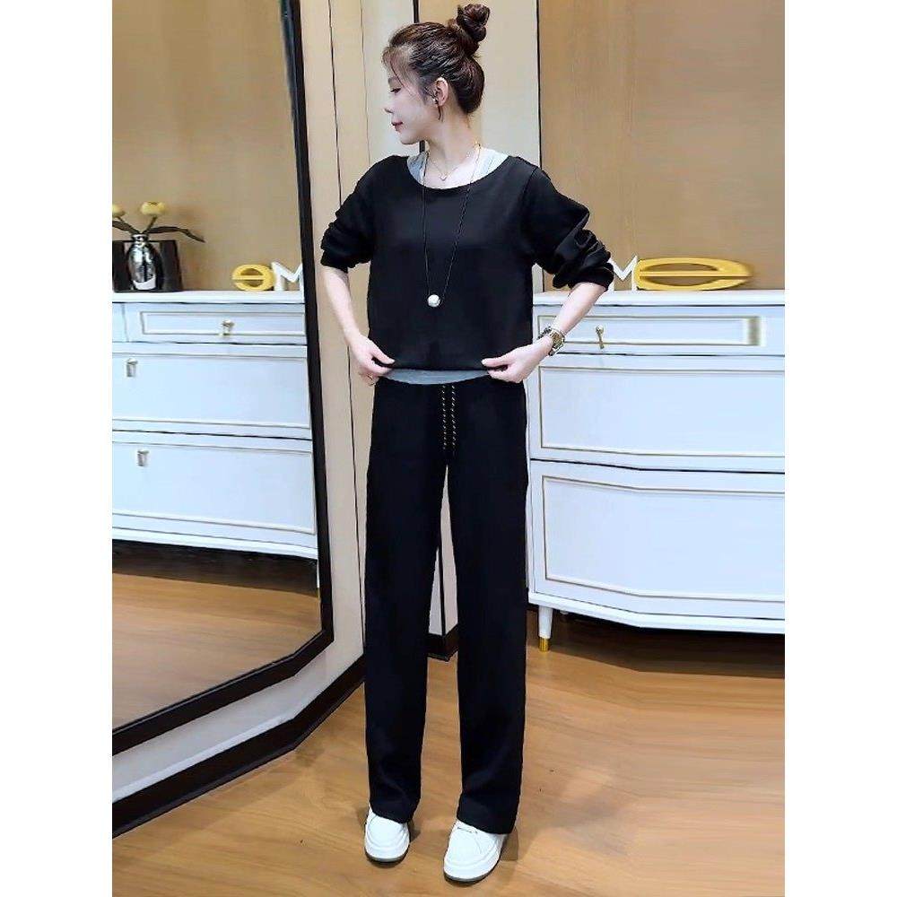 香港代购时尚休闲套装女秋季新款显瘦假两件圆领卫衣阔腿裤两件套