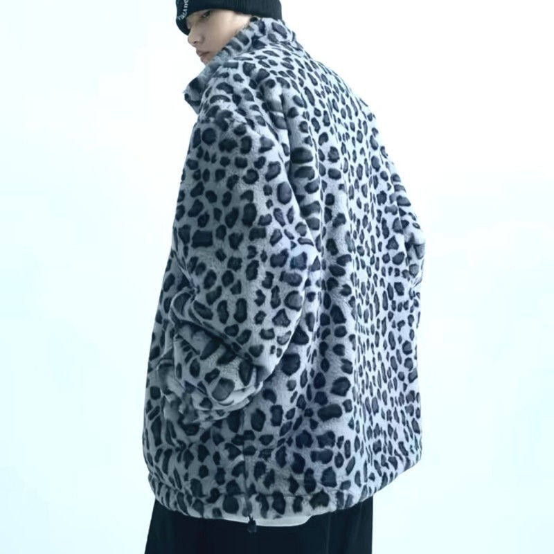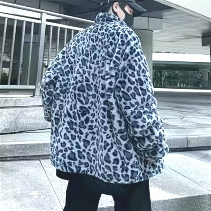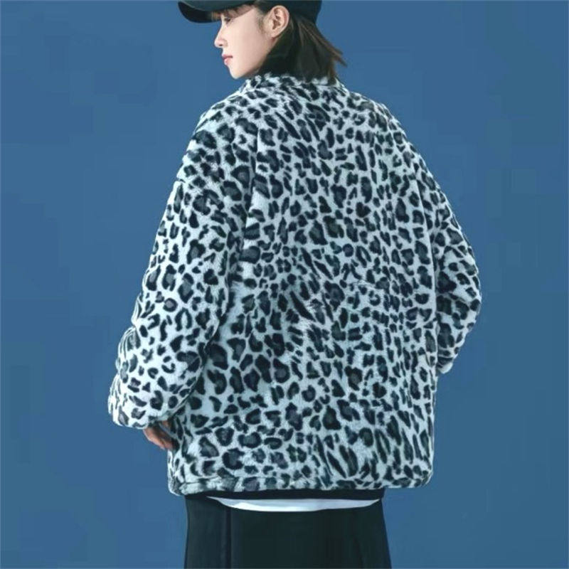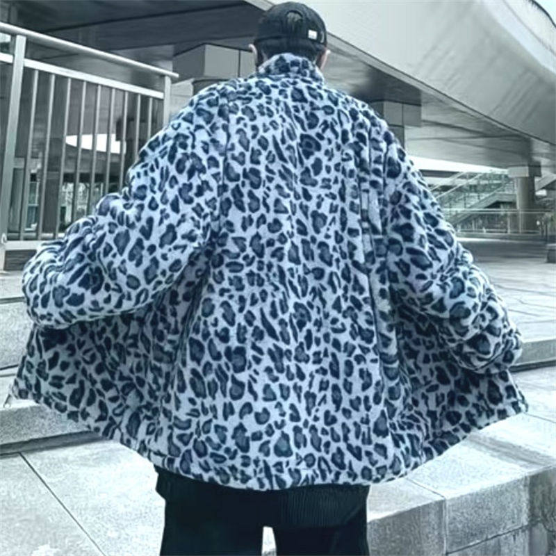 25C11A5秋冬新款豹纹毛绒外套男女棉衣港风立领潮流保暖情侣棉服