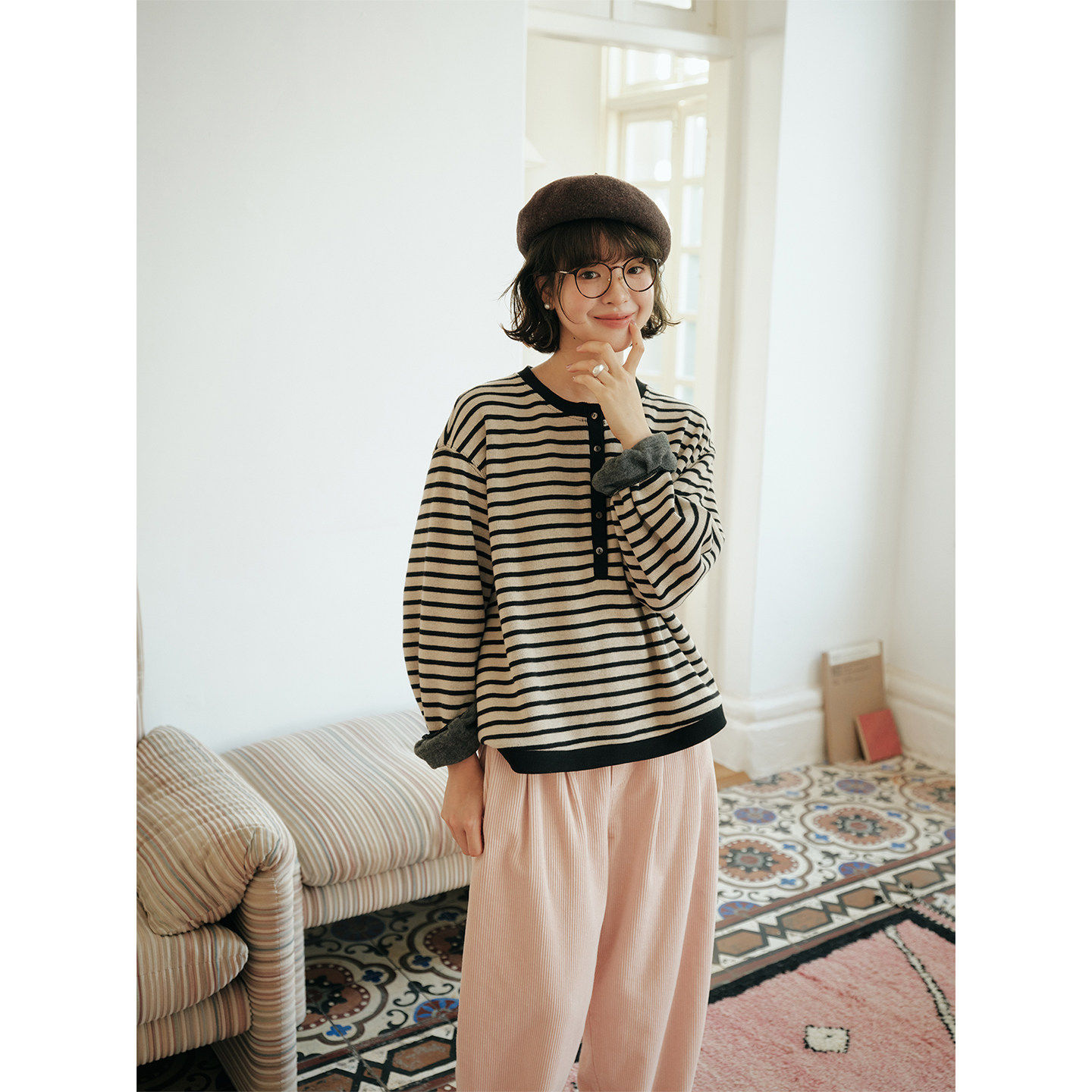 说与山听「静屿」圆领条纹卫衣加绒加厚无帽上衣冬季女休闲61018