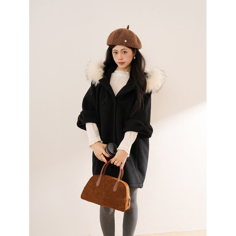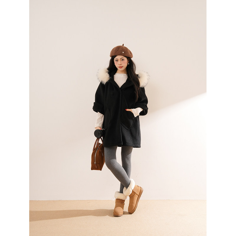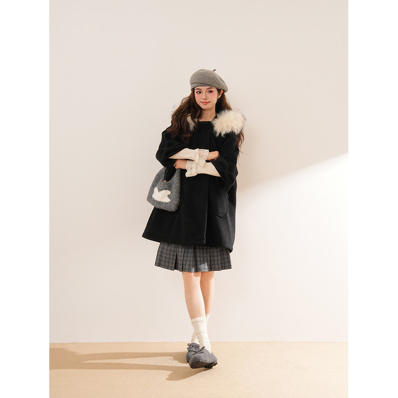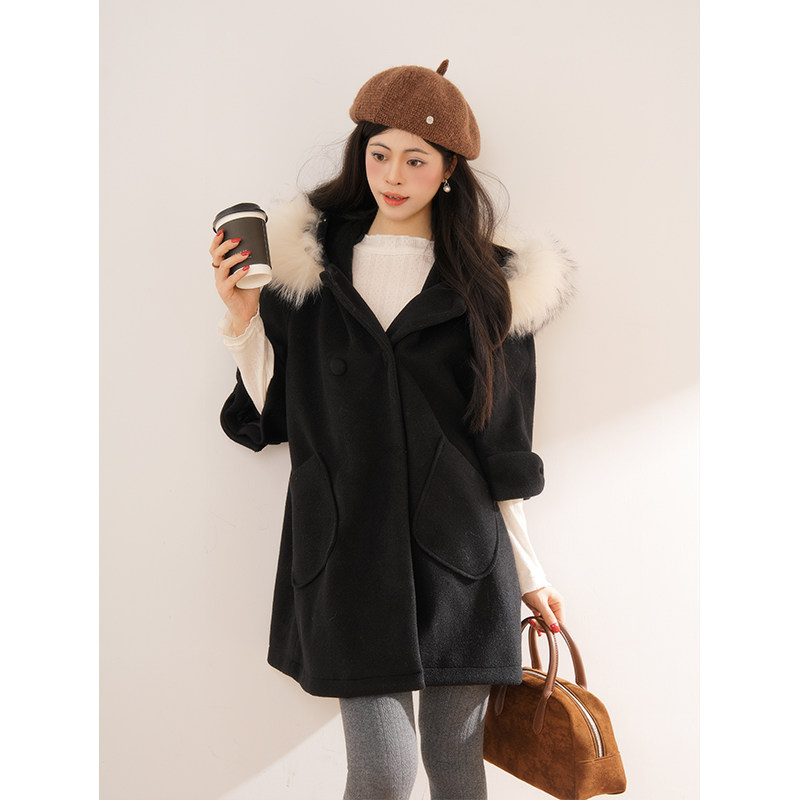 日系中古昭和少女感连帽毛领大衣设计感小众宽松中长款呢子外套女