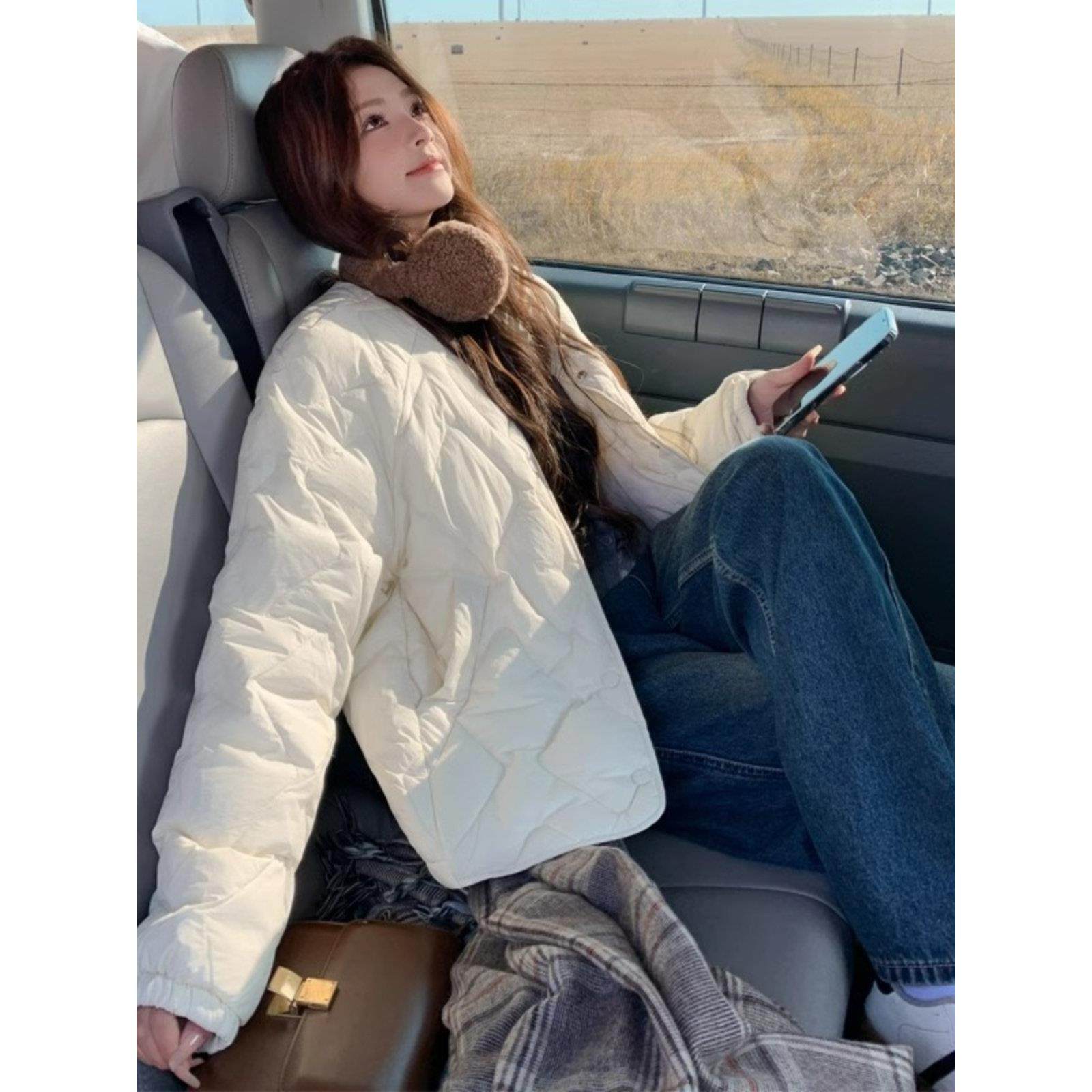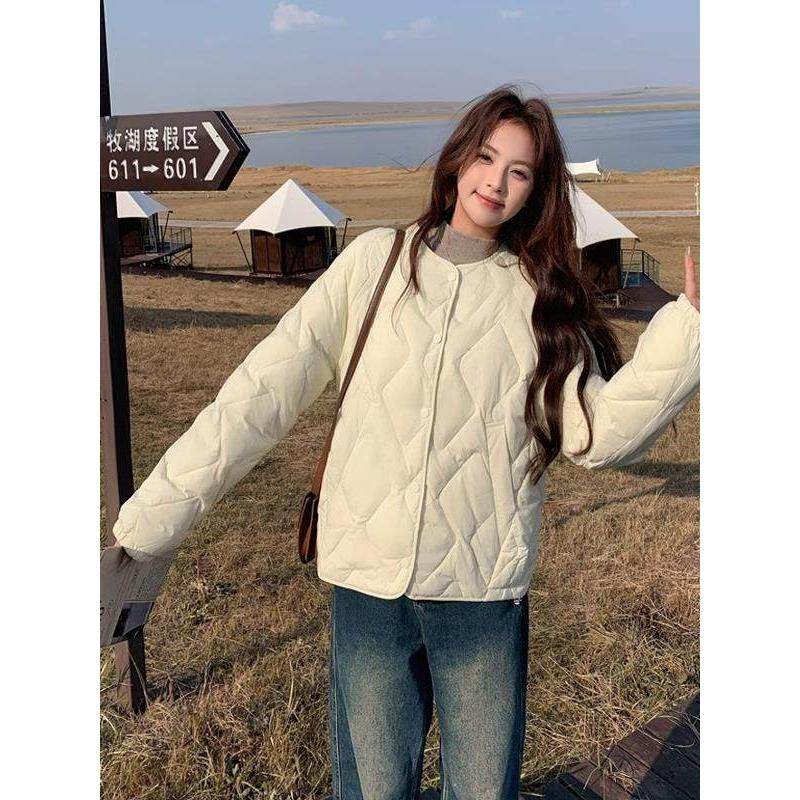 LILY MOST菱格轻薄羽绒服女短款2025冬季新款圆领米白色90白鸭绒