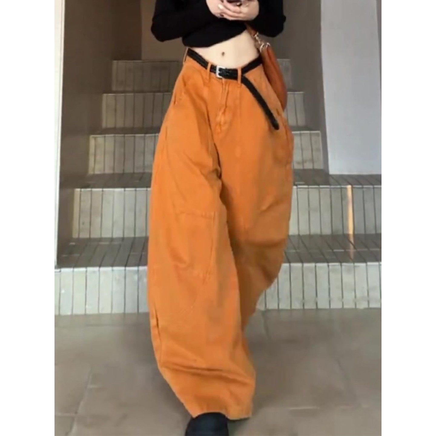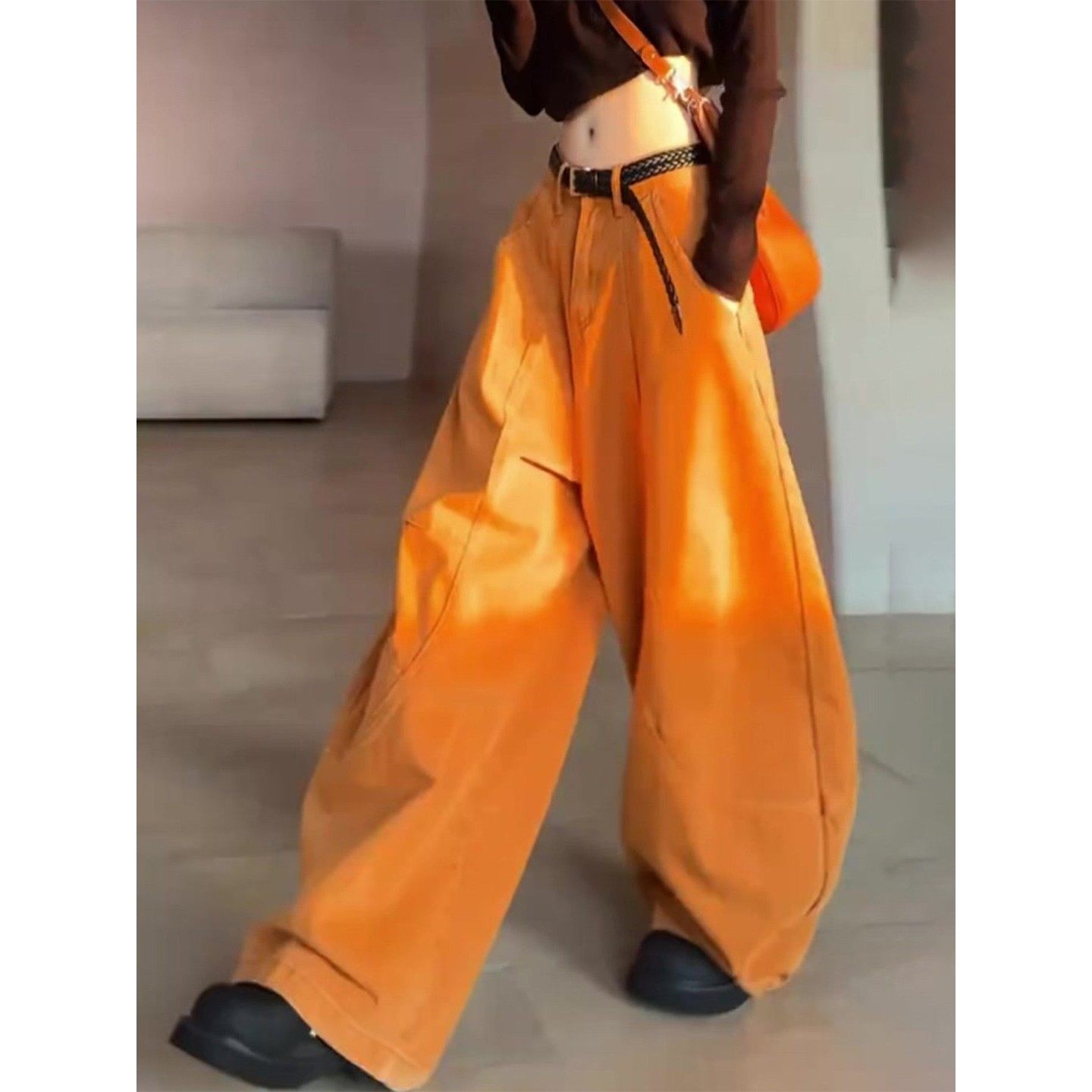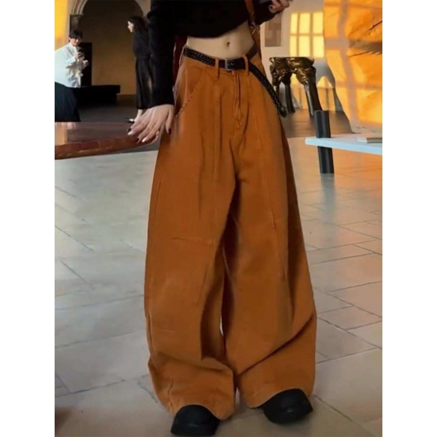 琥珀流光橘黄色弯刀牛仔裤女2025年秋季新款高腰显瘦宽松阔腿长裤