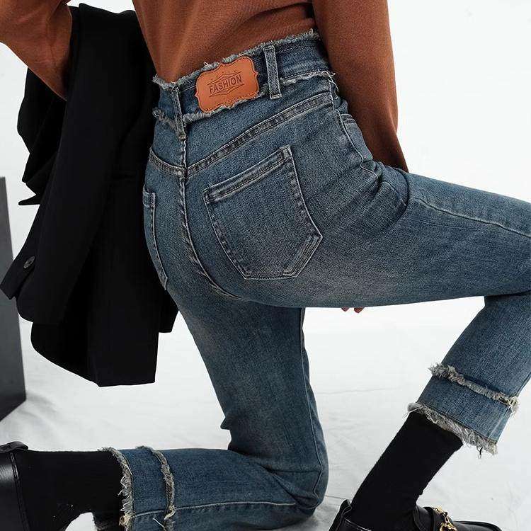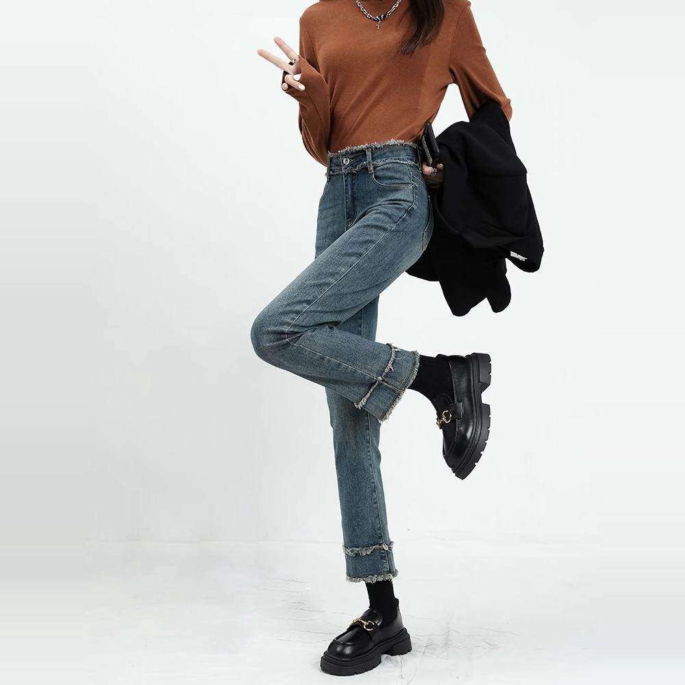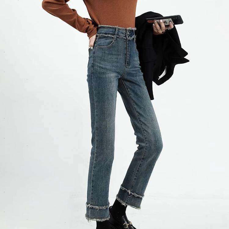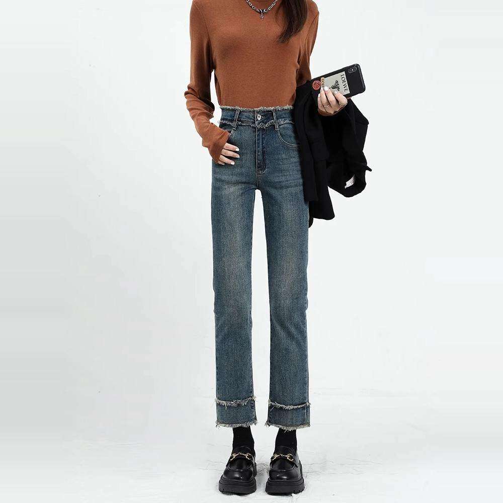 设计感毛边直筒牛仔裤女2025年早秋加绒高腰显高显瘦复古烟管裤