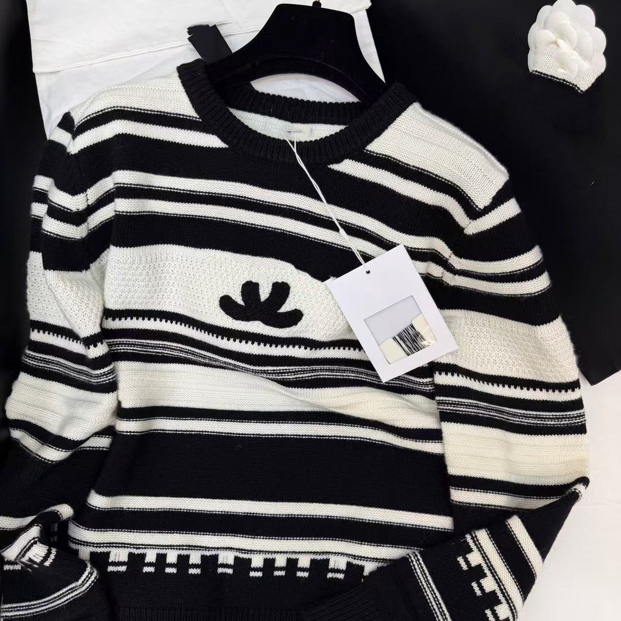 好漂亮黑白拼色条纹针织羊毛套头衫女2026年早春新款短上衣宽松潮