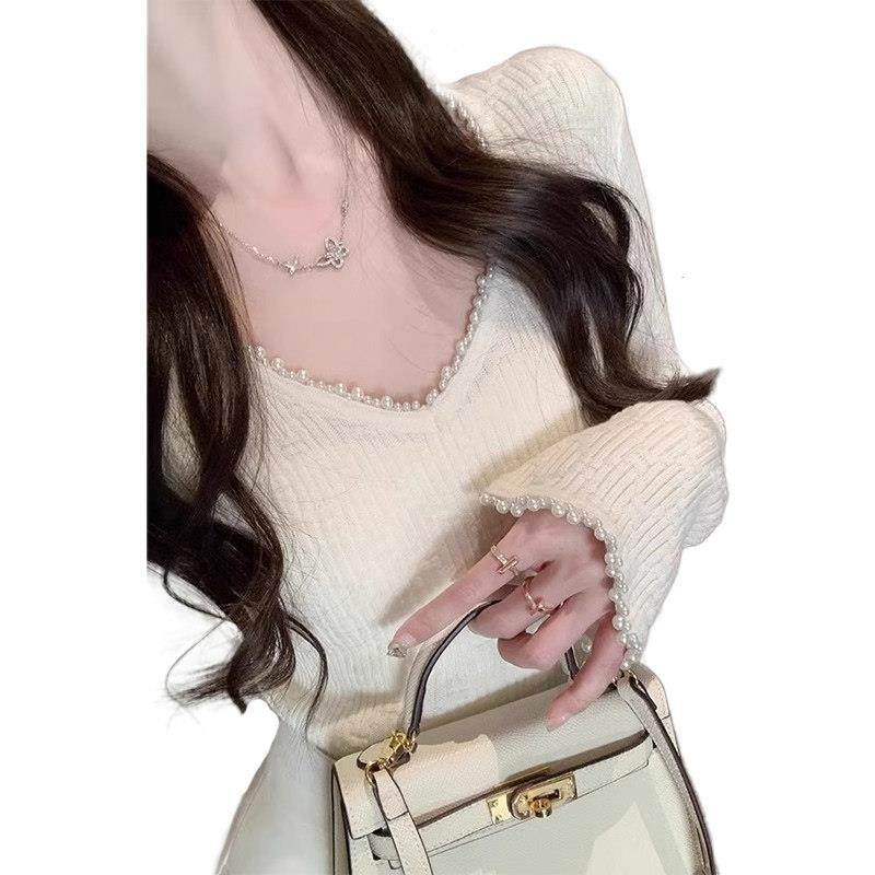 白色针织衫女秋季短款修身毛衣设计感冬季流行风格钉珠低领打底衫