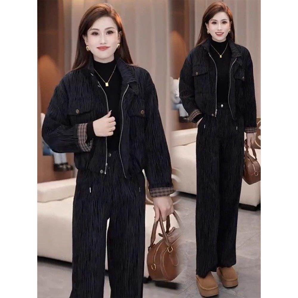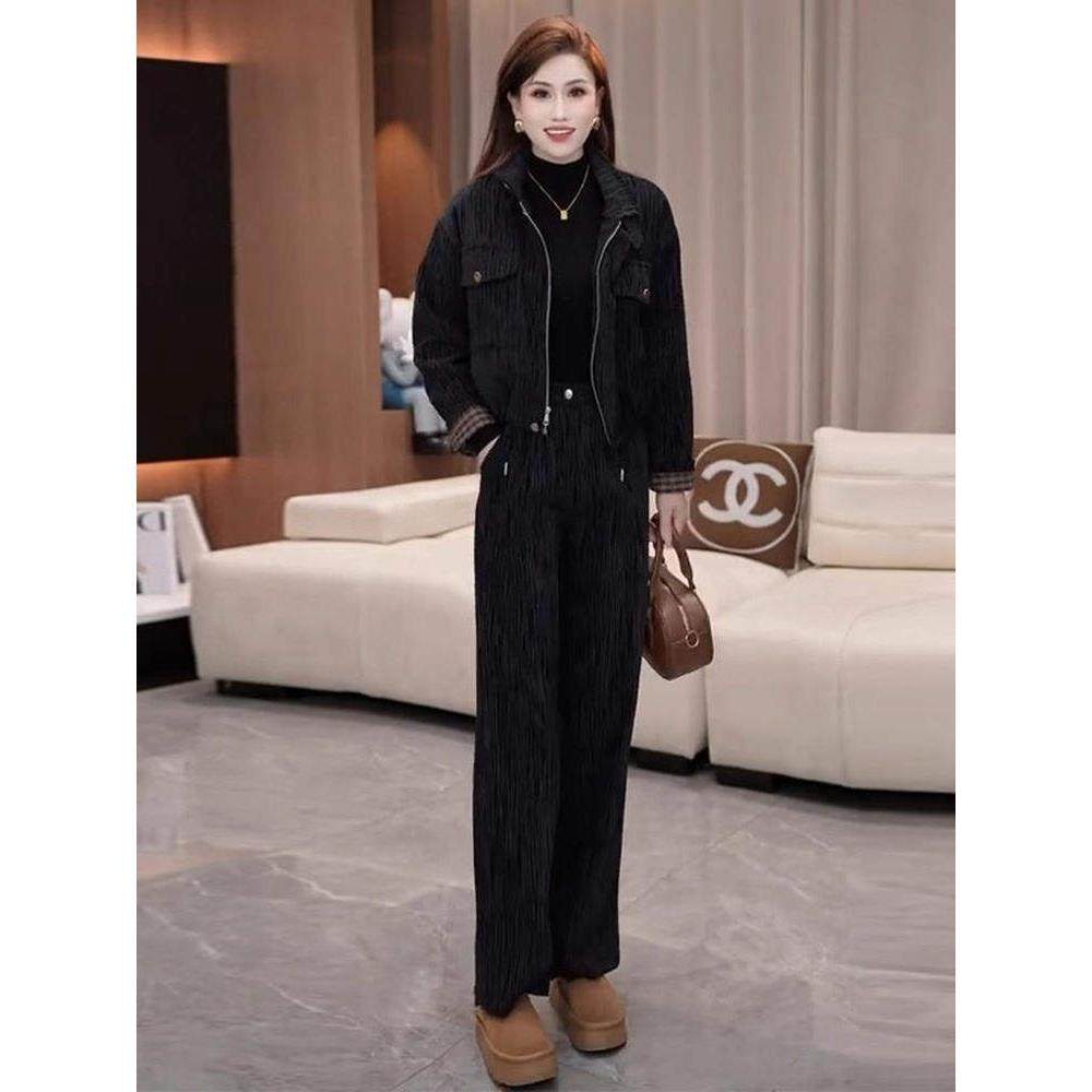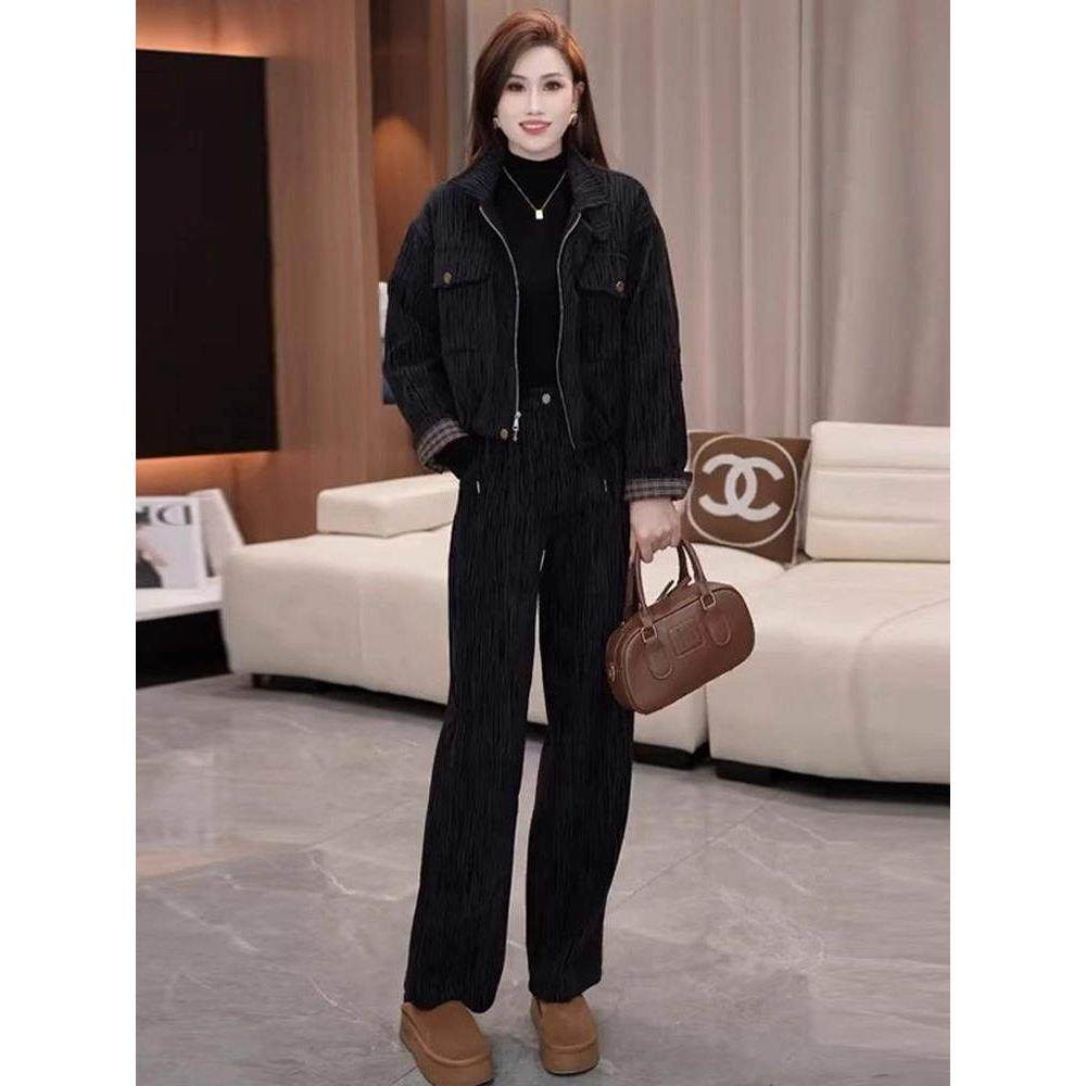 香港代购时尚雪尼尔套装女冬季显瘦夹棉加厚短款外套阔腿裤两件套