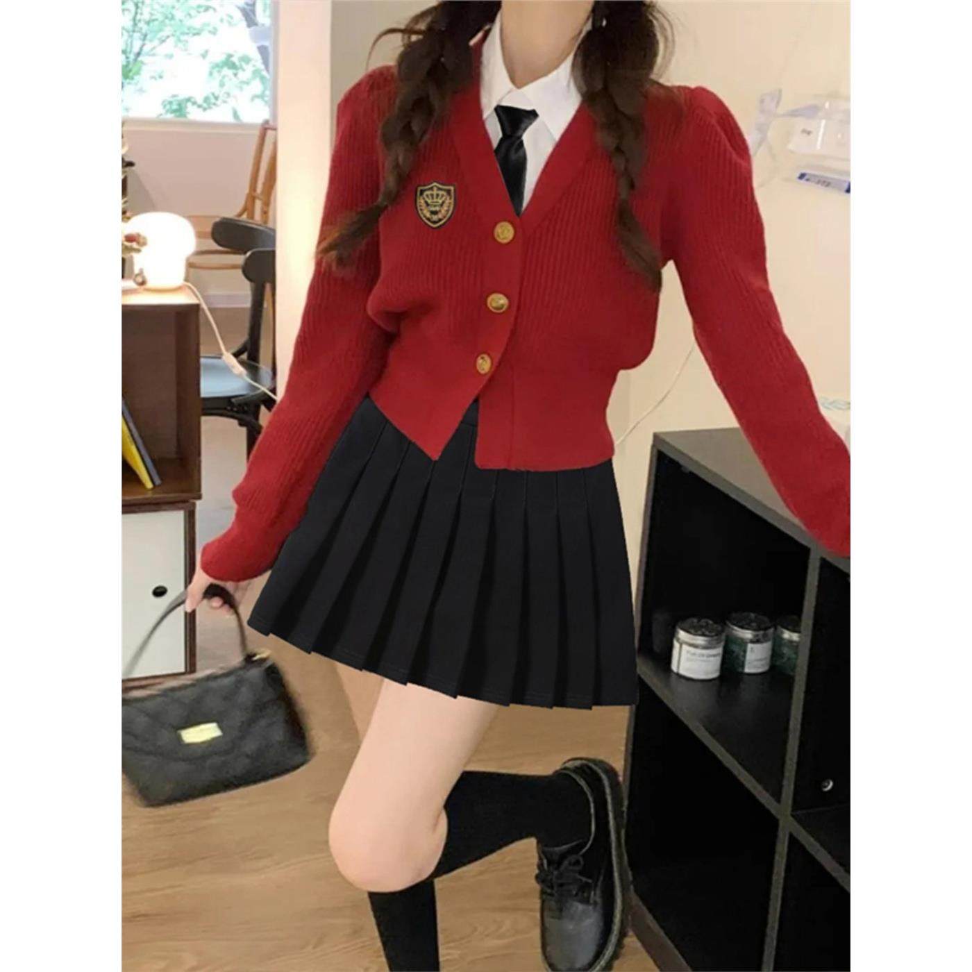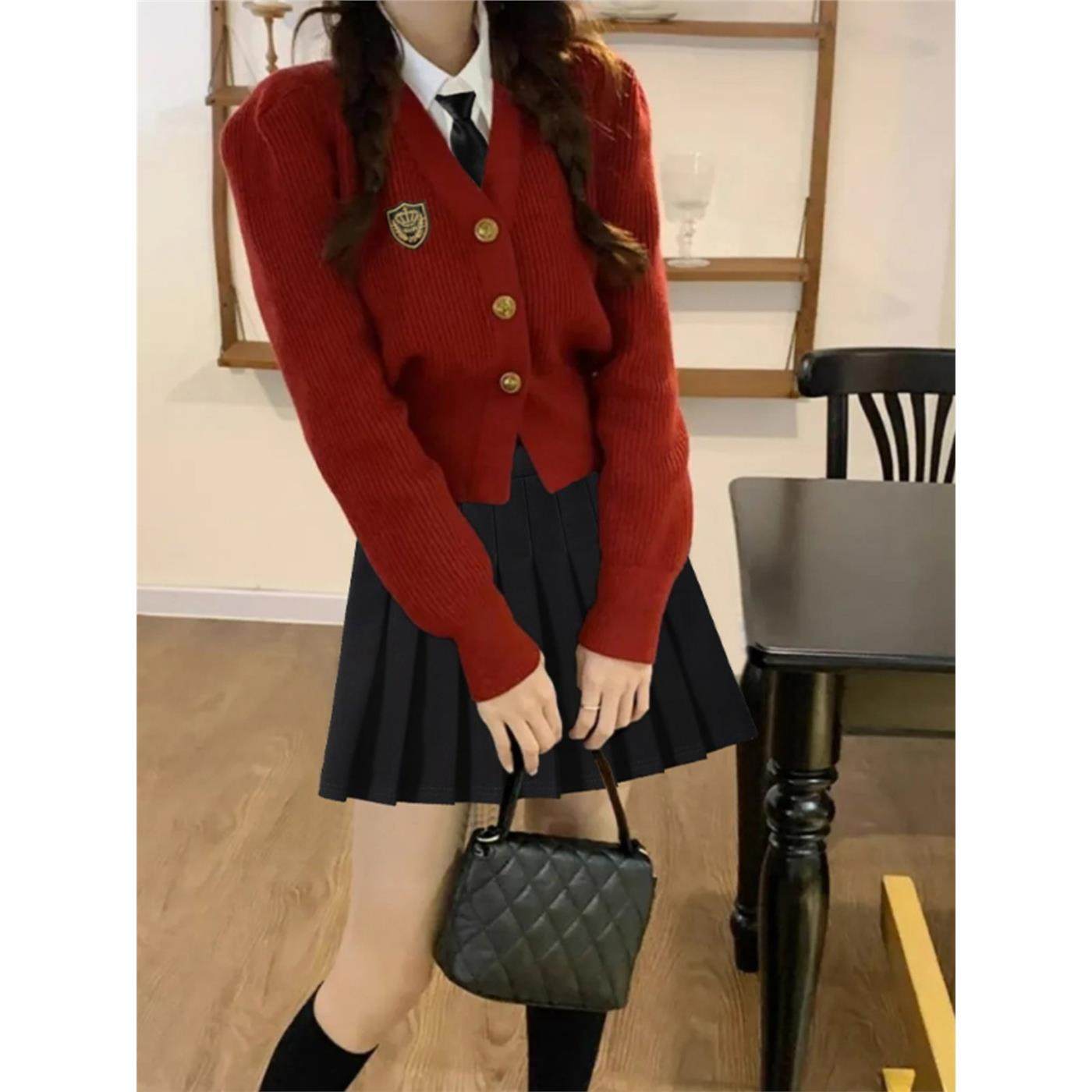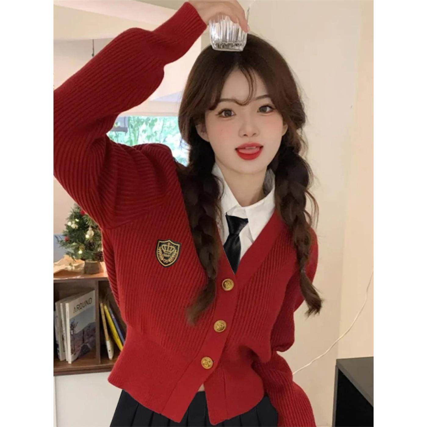 本年命红色毛衣开衫针织外套女2025新款秋冬季小香风短上衣jk套装