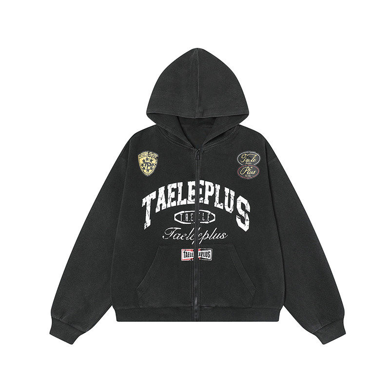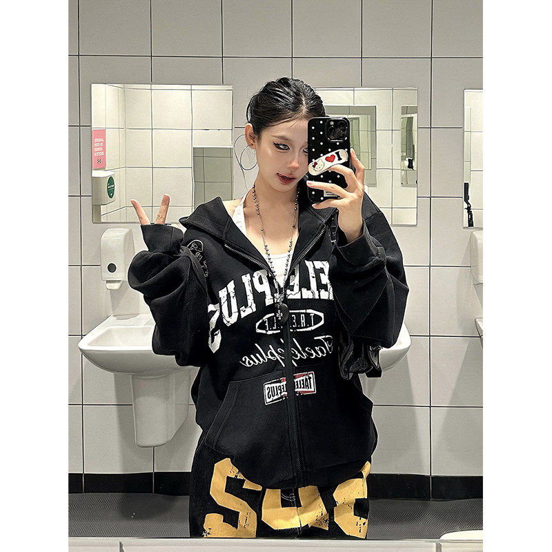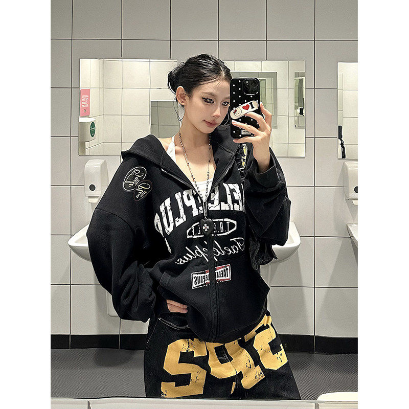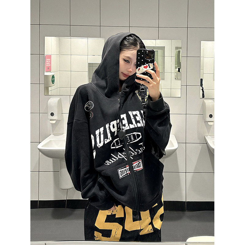 爆爆糖美式复古字母印花做旧水洗连帽开衫卫衣男女秋宽松拉链外套