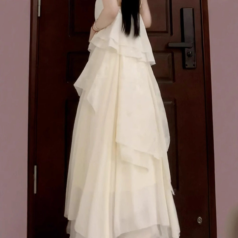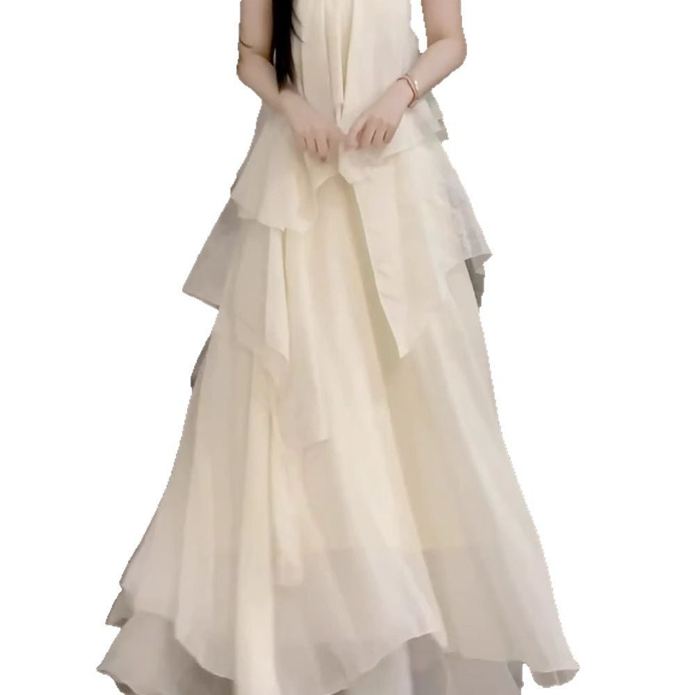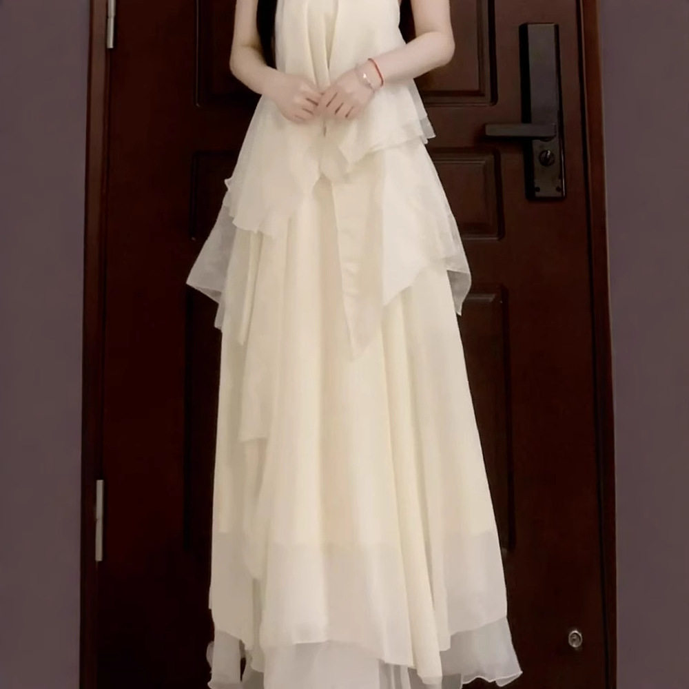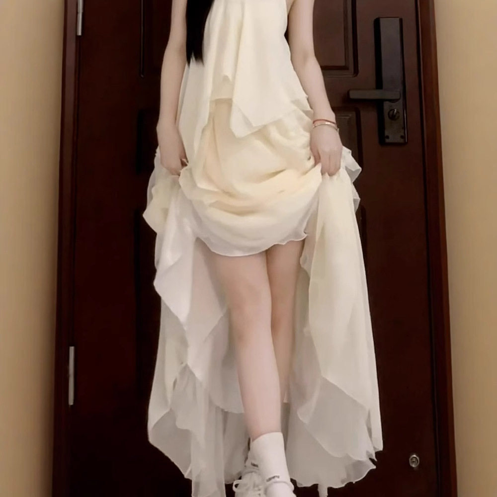 2025新款杏色吊带连衣裙子女装夏季法式小个子海边度假不规则长裙