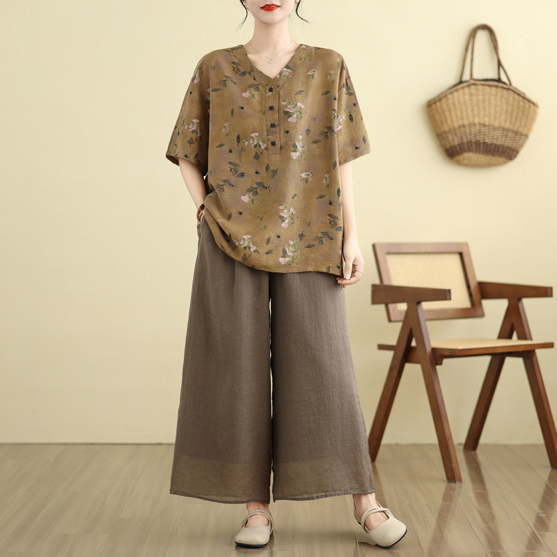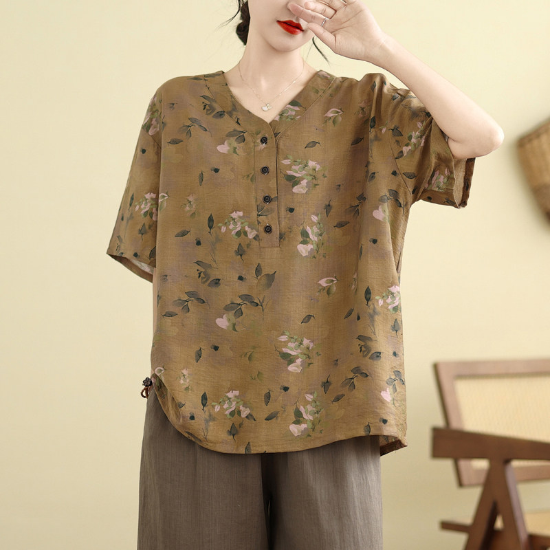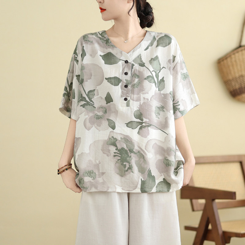 复古印花大码女装夏季新款胖mm中老年棉麻上衣女宽松V领短袖上衣