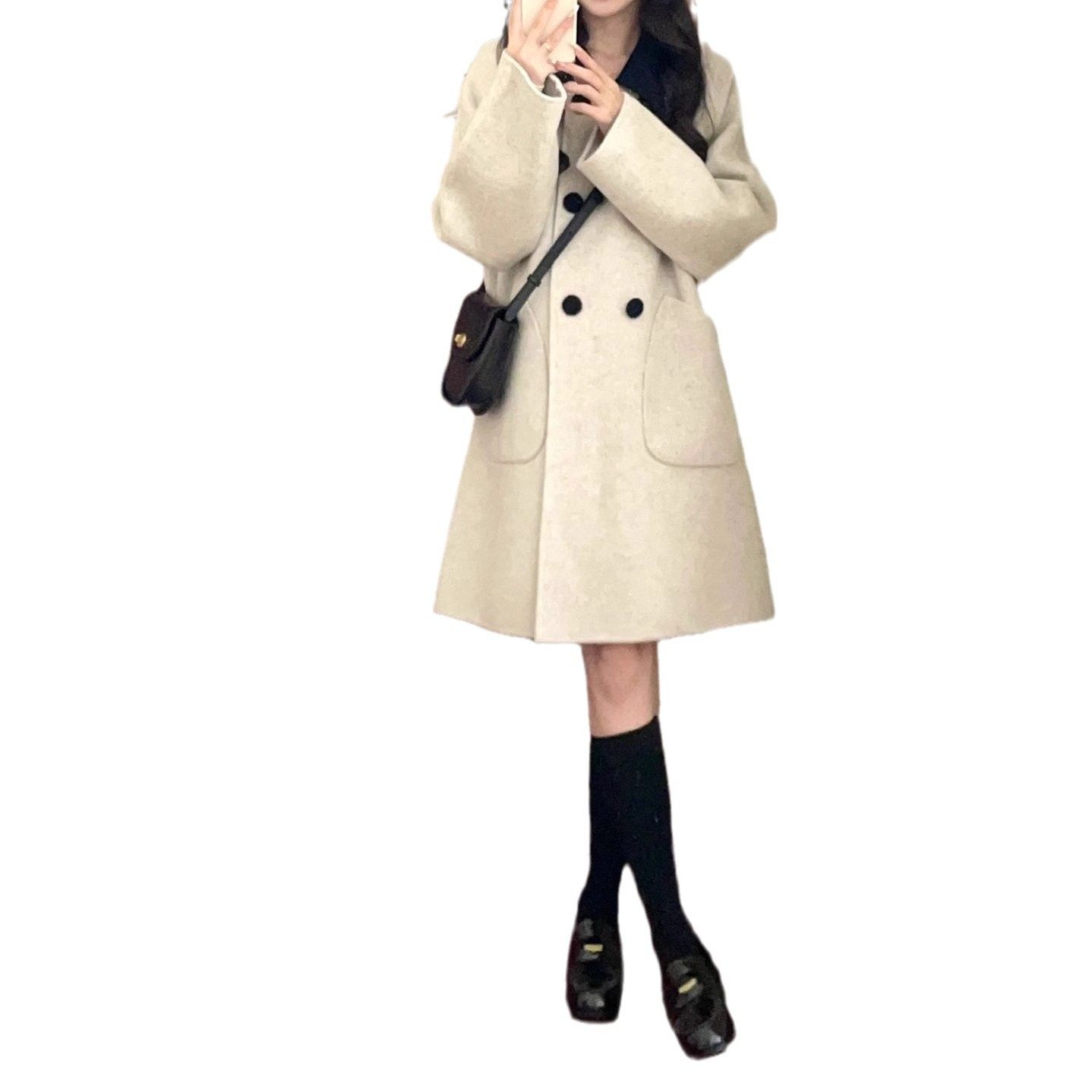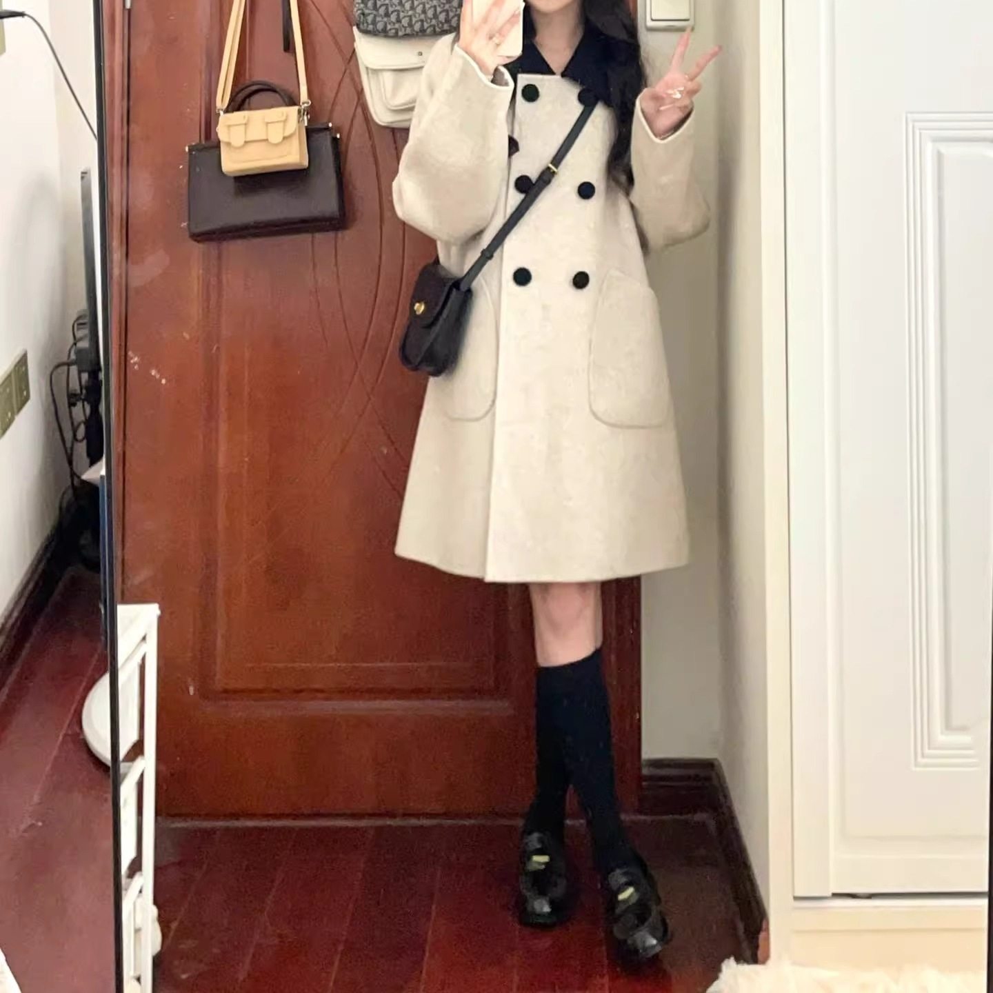 冬季韩系小个子复古撞色翻领短款高级毛呢大衣呢子外套女宽松显高