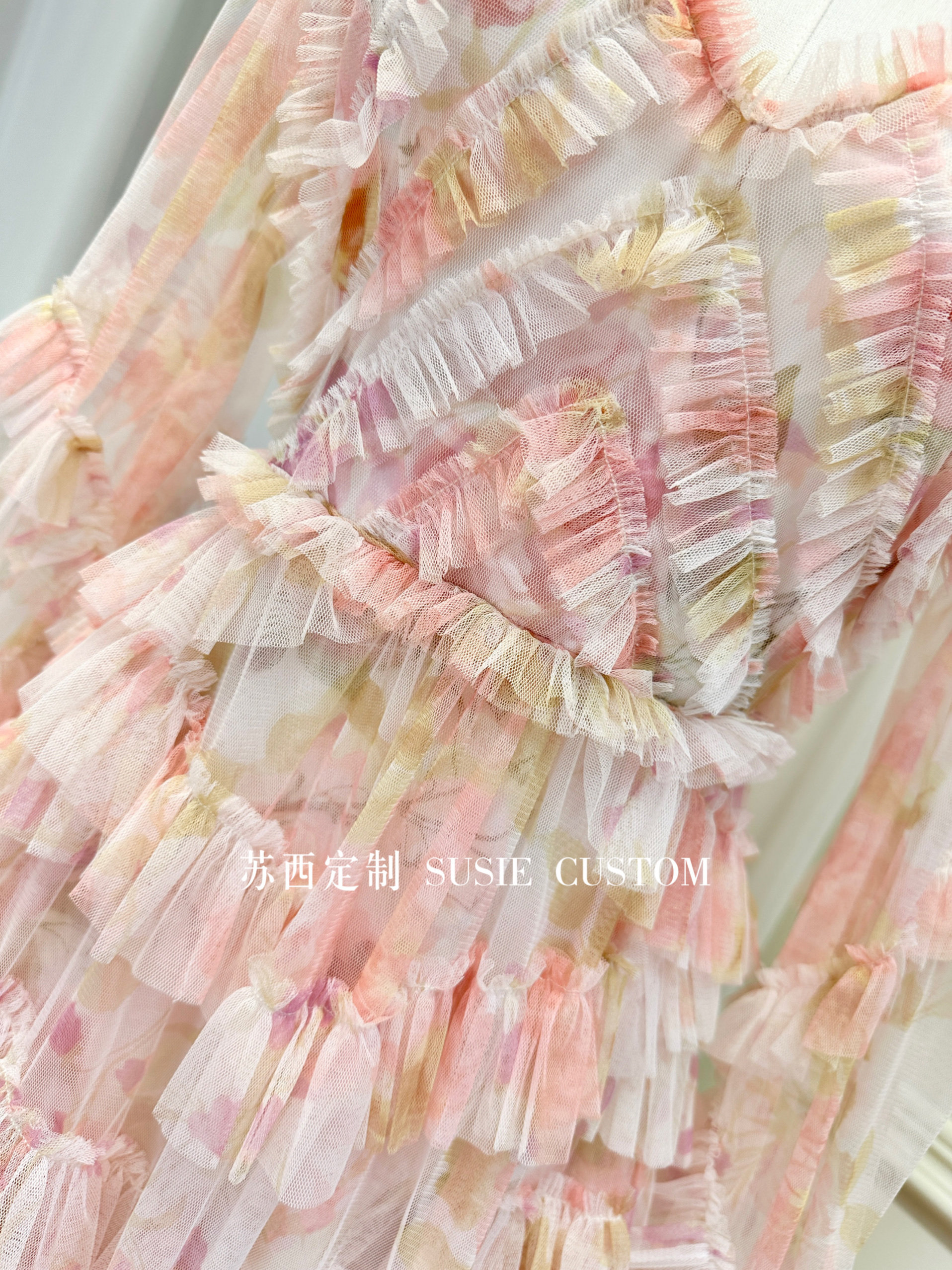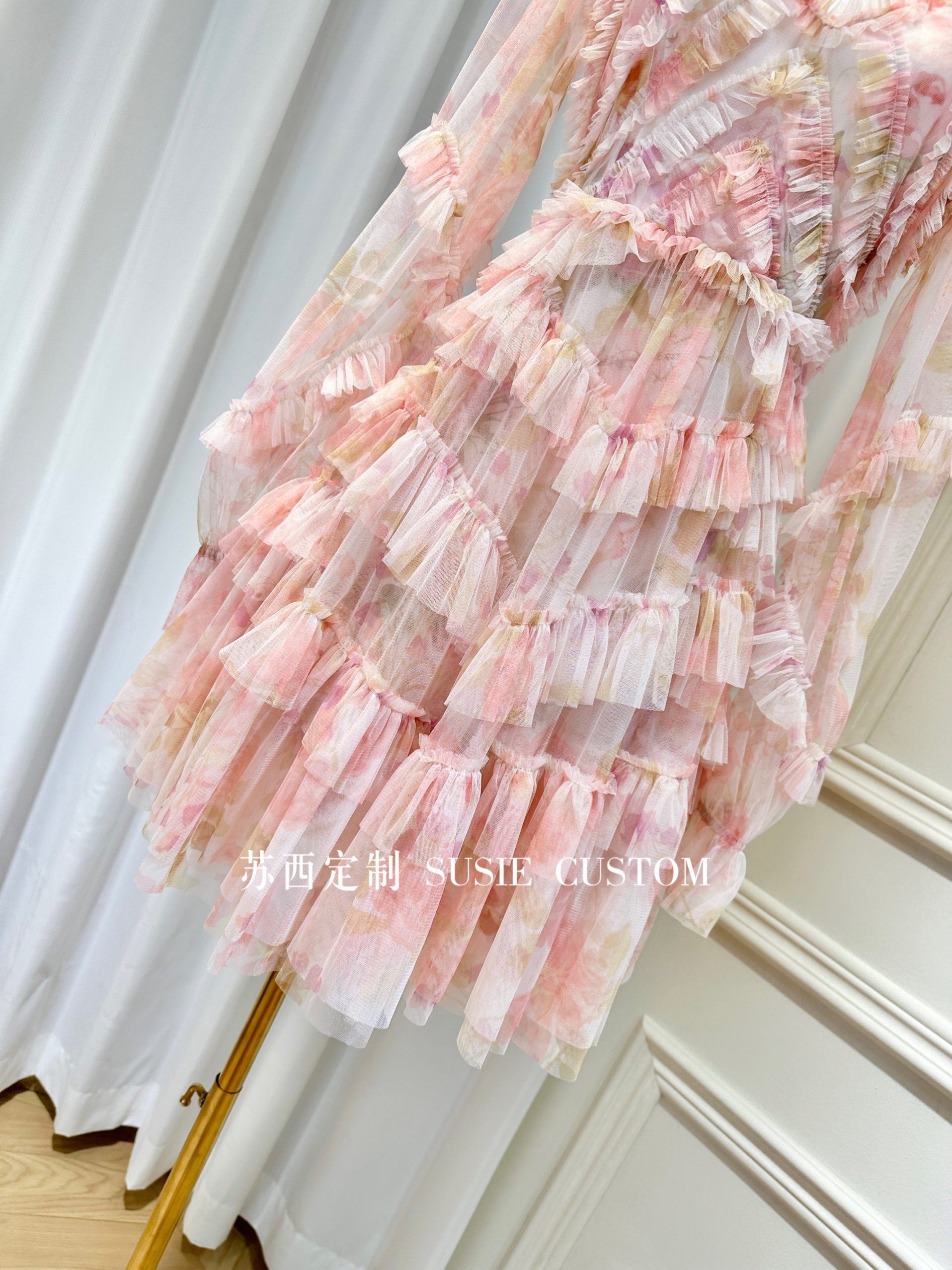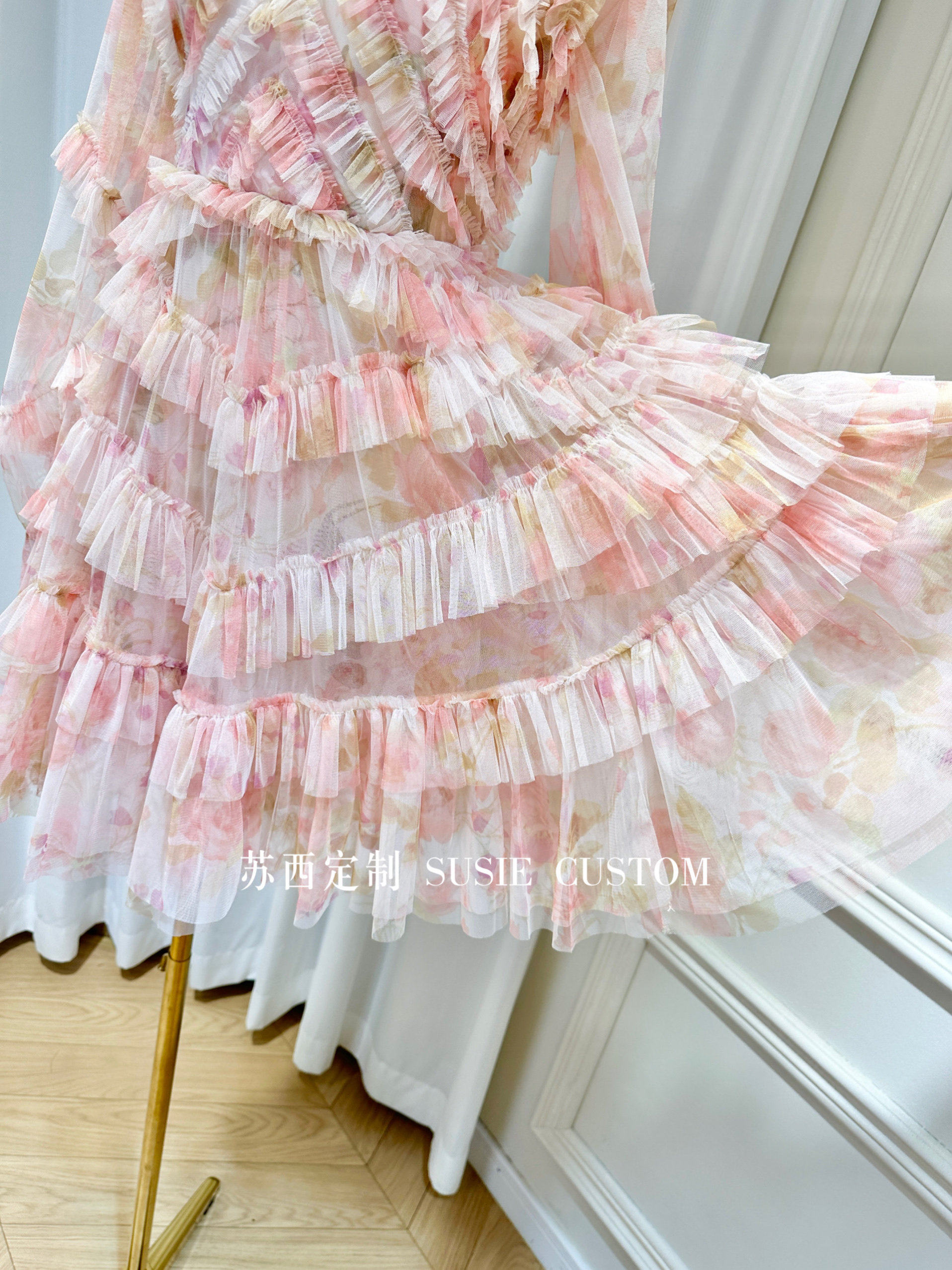 高定制仙女款温柔森系V领不规则褶皱荷叶边网纱印花层层蛋糕短裙