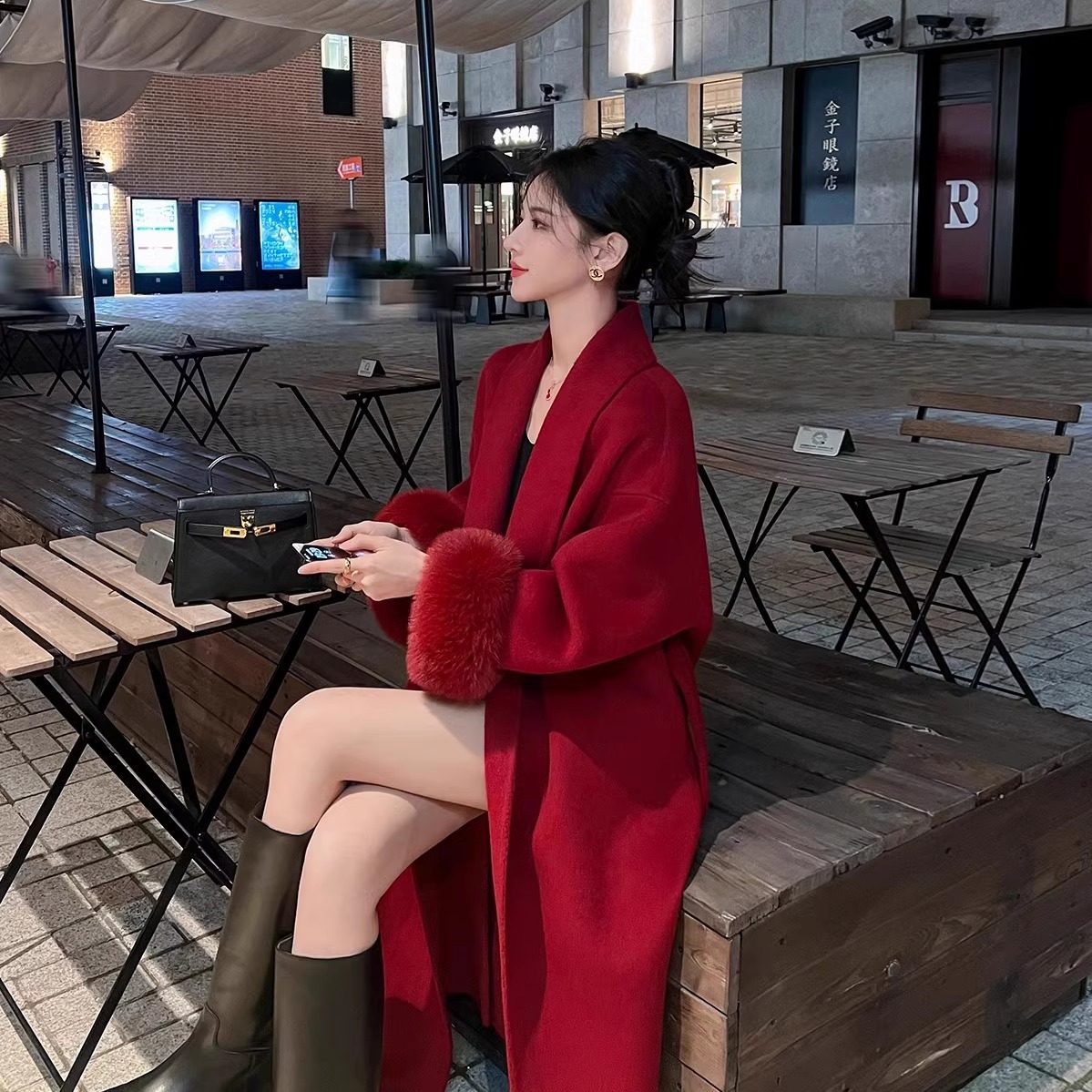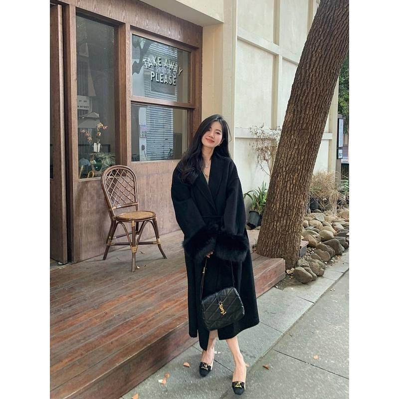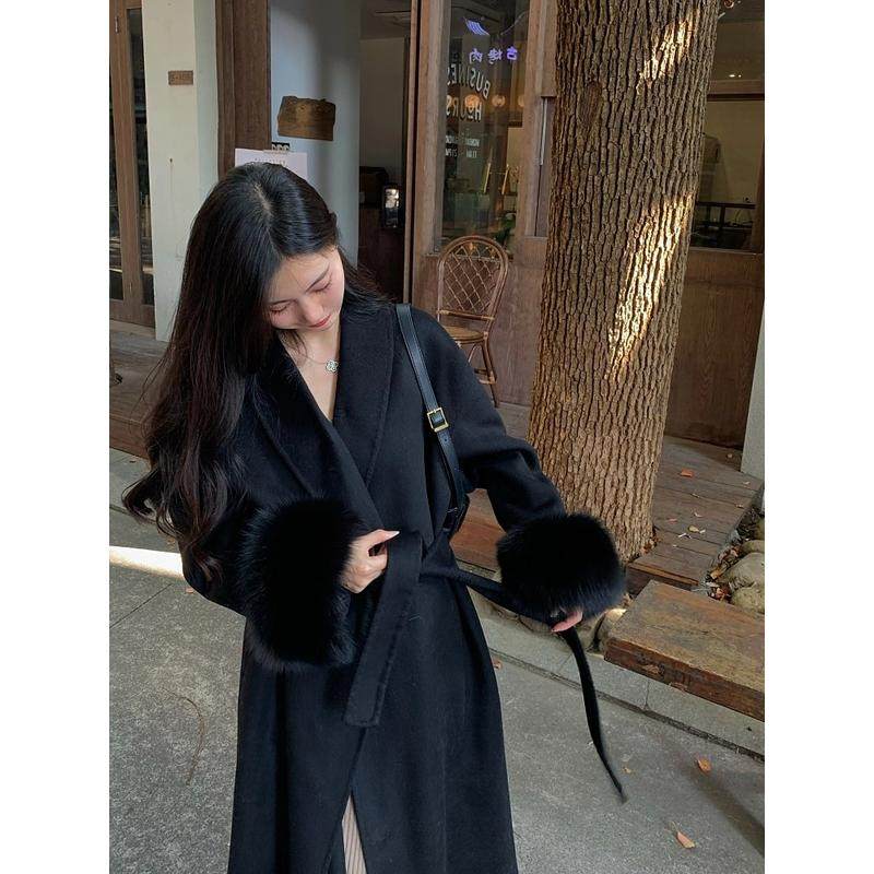 红色2024年新款双面羊毛大衣女高个子长款仿狐狸毛高级感毛呢外套