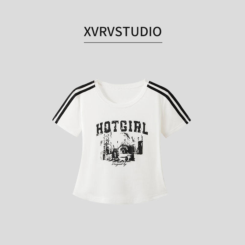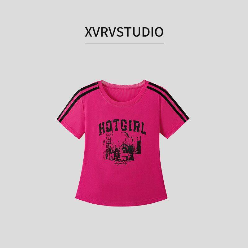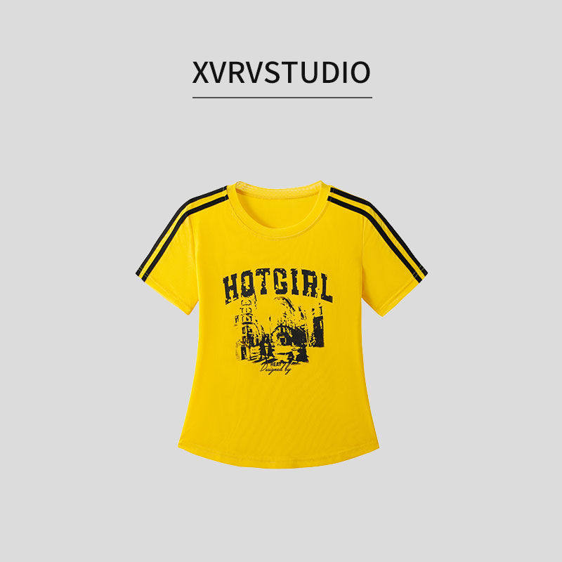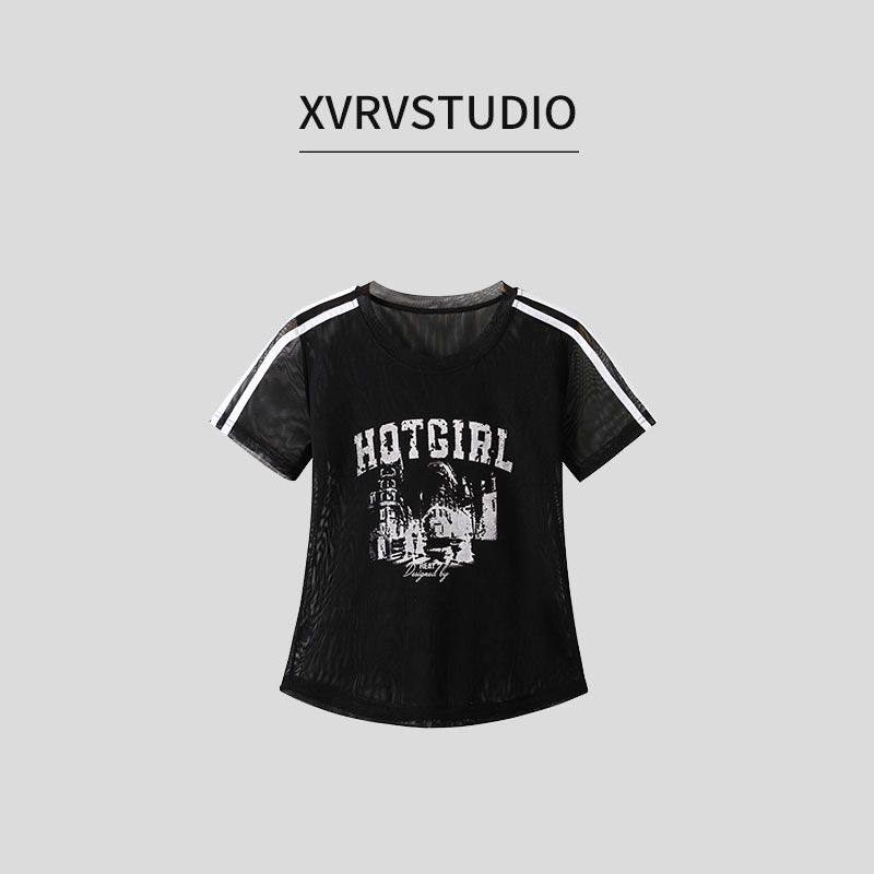 XVRV【夏上新】网纱冰感条纹印花女时尚显瘦运动短袖跑步健身上衣