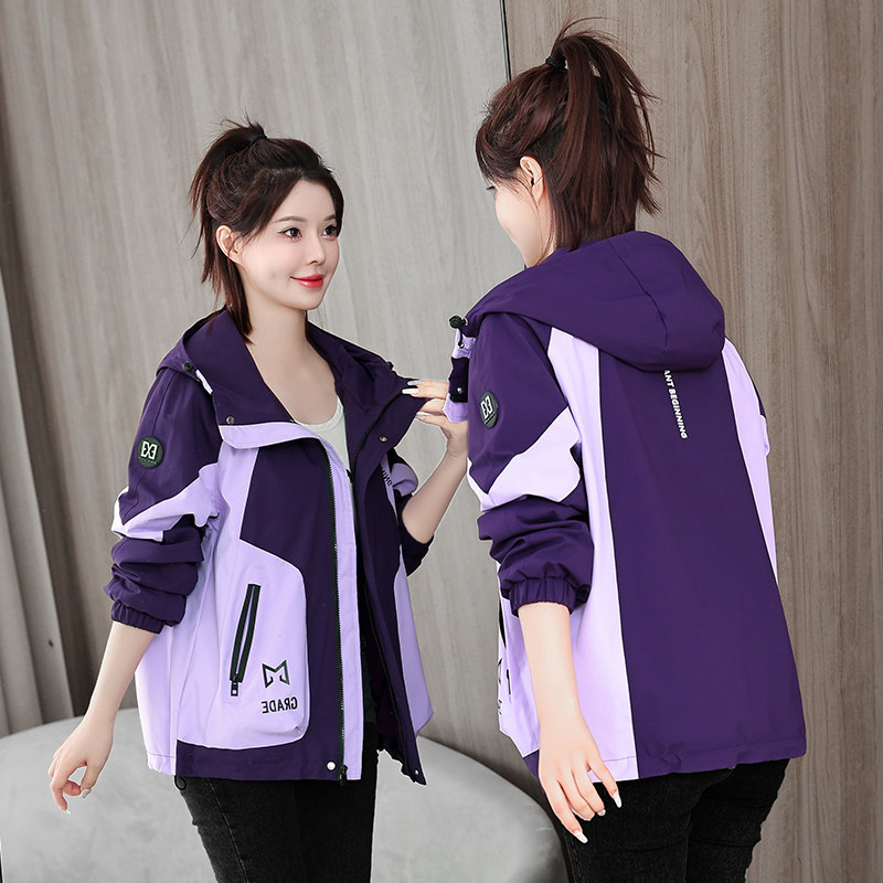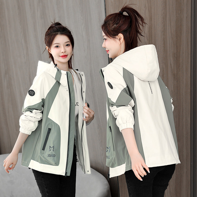 2025春季新款休闲宽松冲锋衣短款连帽拼接撞色工装运动外套女上衣