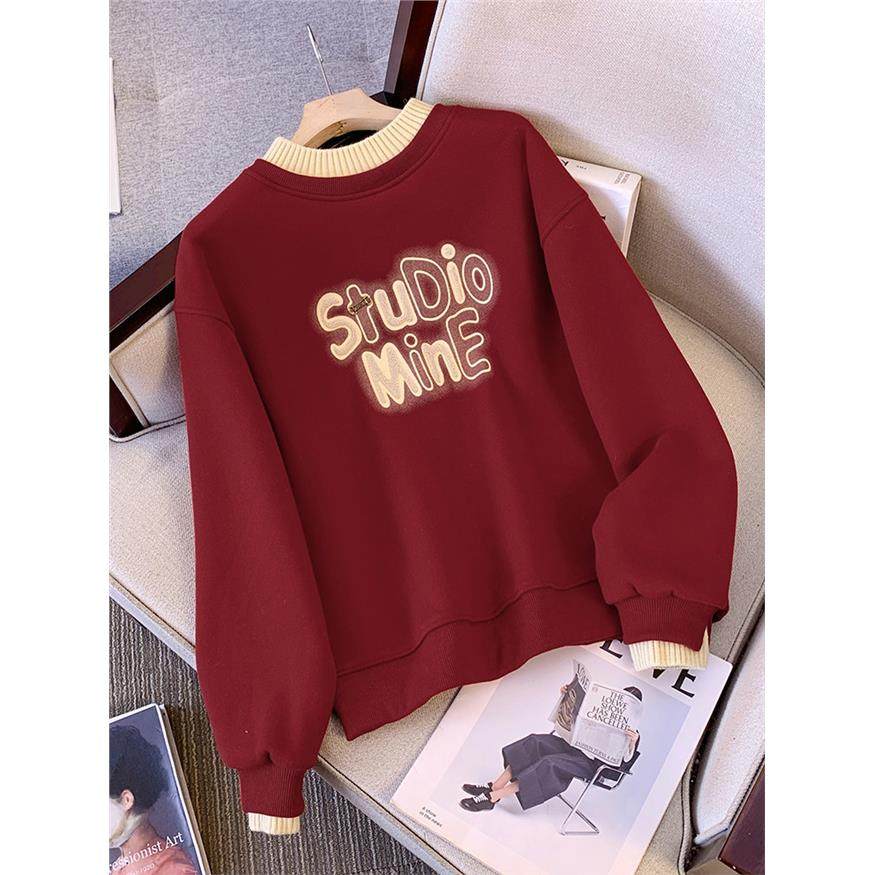 红色加绒卫衣女士新款2025爆款时尚洋气小个子秋冬季加厚圆领上衣