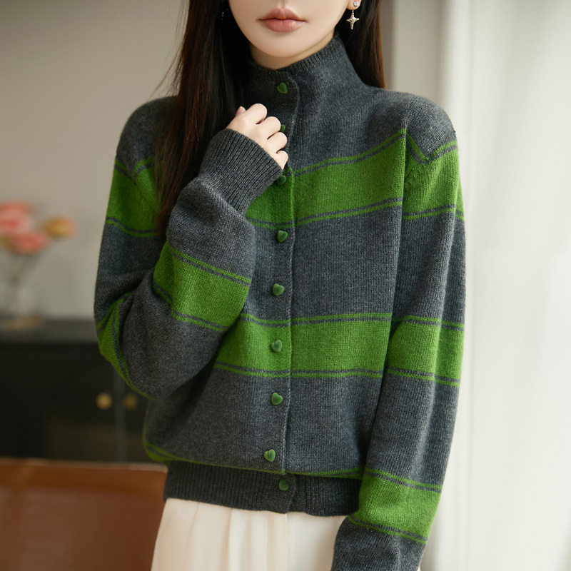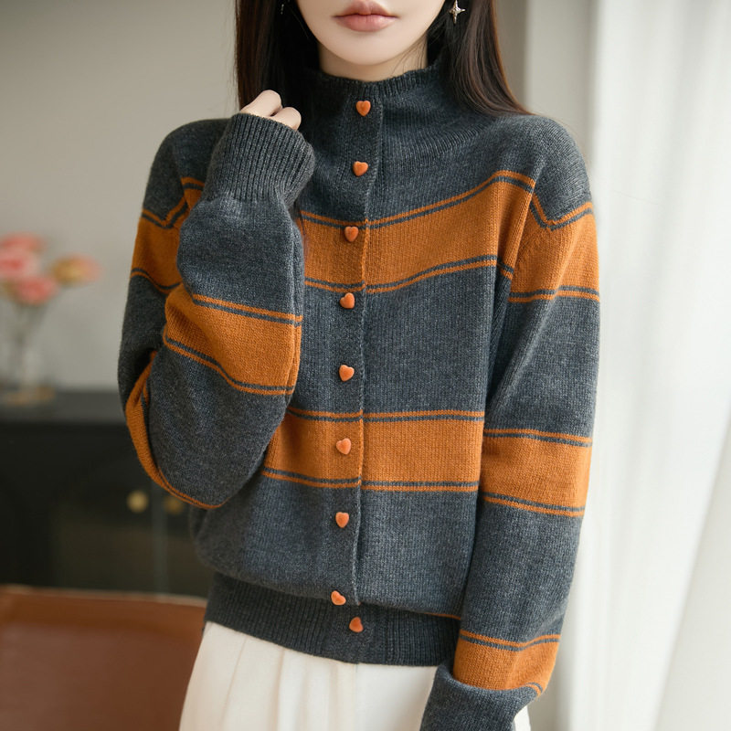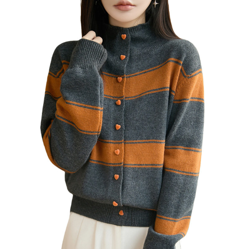 半高领撞色条纹针织开衫外套秋冬宽松毛衣女上衣爱心扣外搭