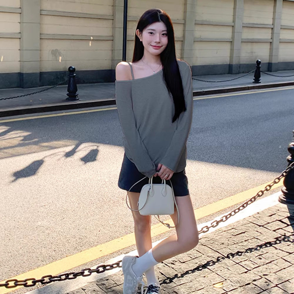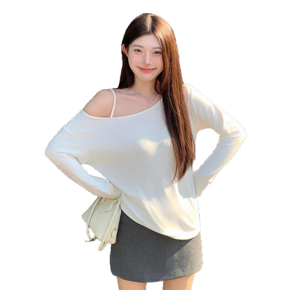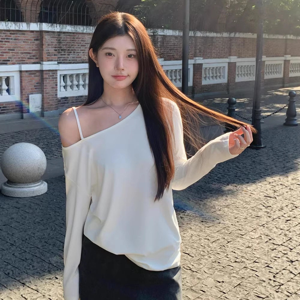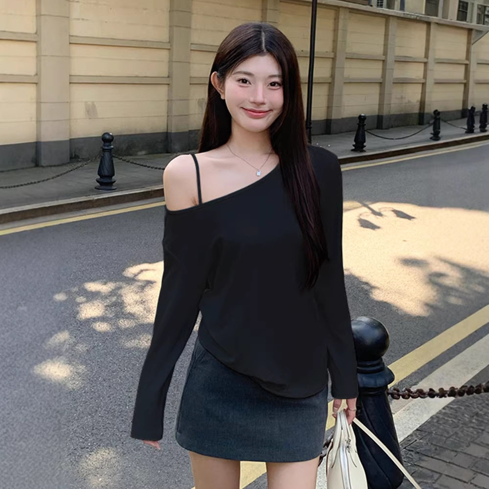 首页> 女装> 露肩慵懒斜肩上衣女春季小众设计感露肩气质简约一字肩长袖袖T恤