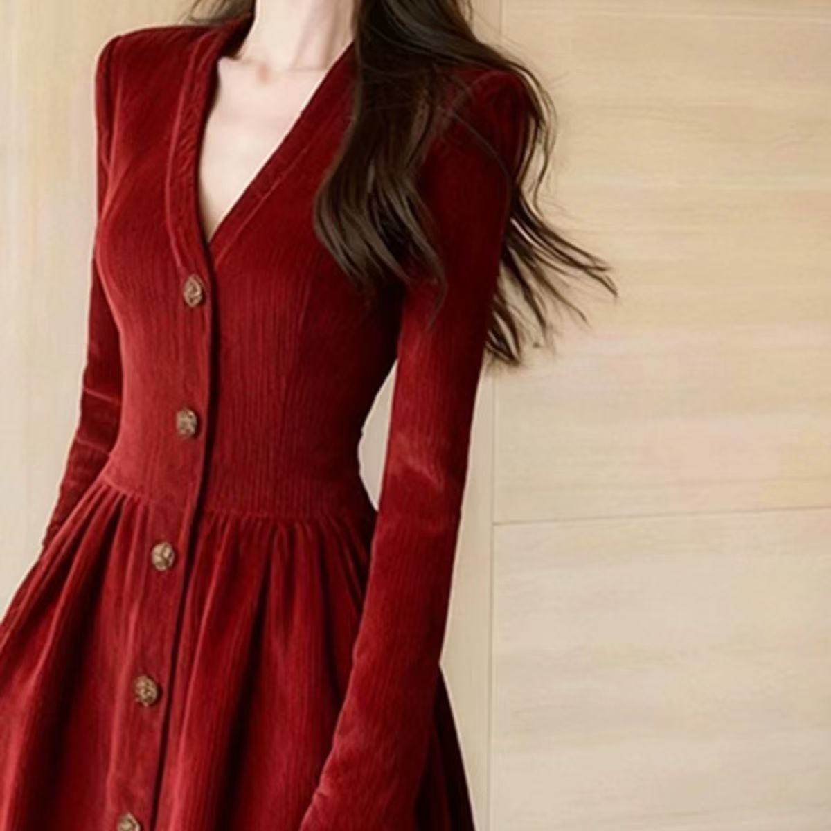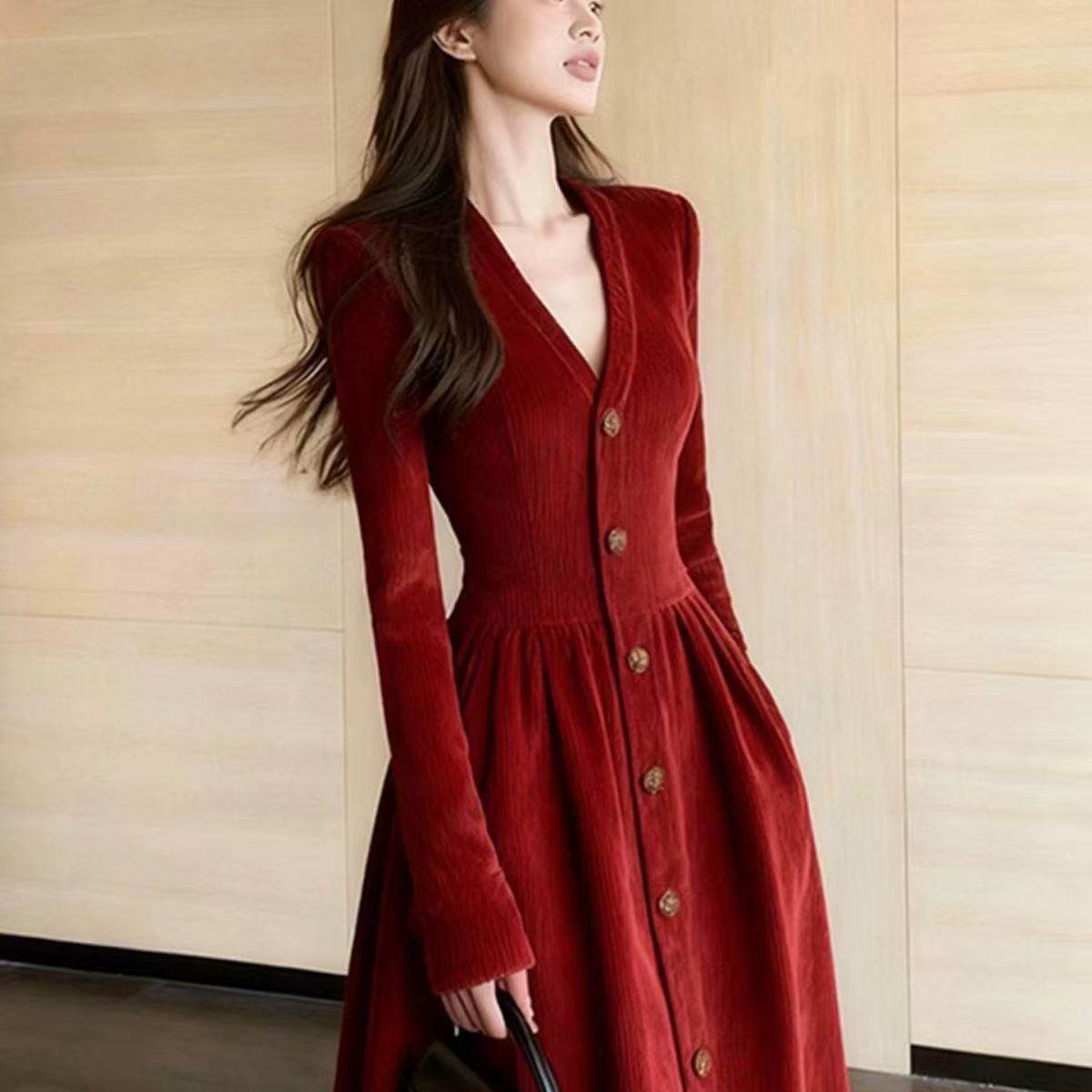 清冷富家千金穿搭红色灯芯绒v领收腰连衣裙女冬重要场合漂亮裙子