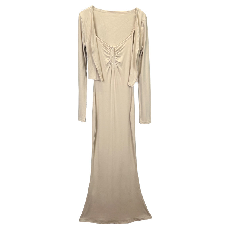 韩国东大门新款气质纯欲风低胸性感吊带连衣裙+长袖开衫女两件套
