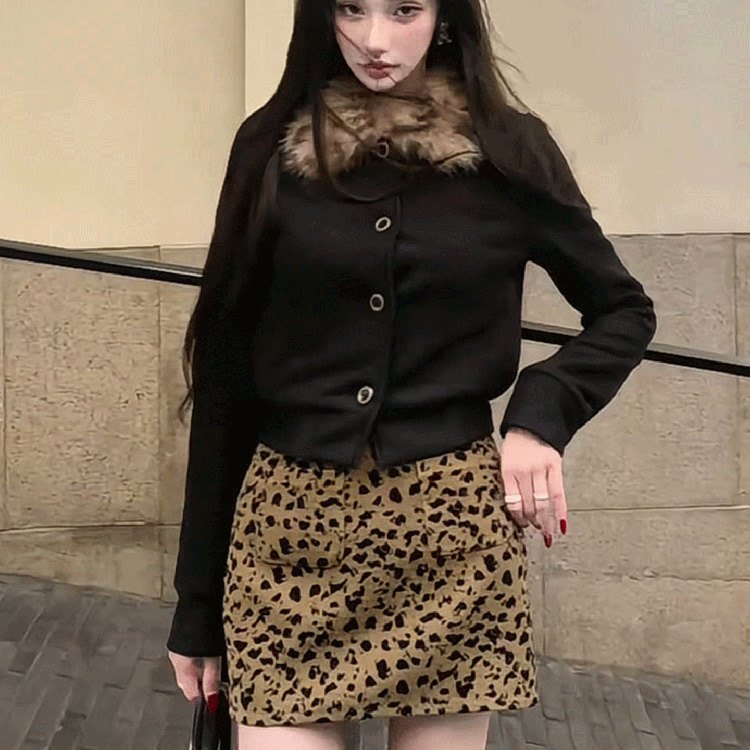 2025秋冬新款美式复古黑色毛领短外套针织上衣+豹纹a字短裙两件套