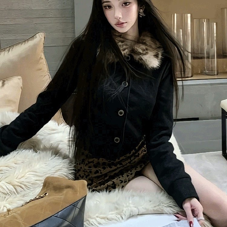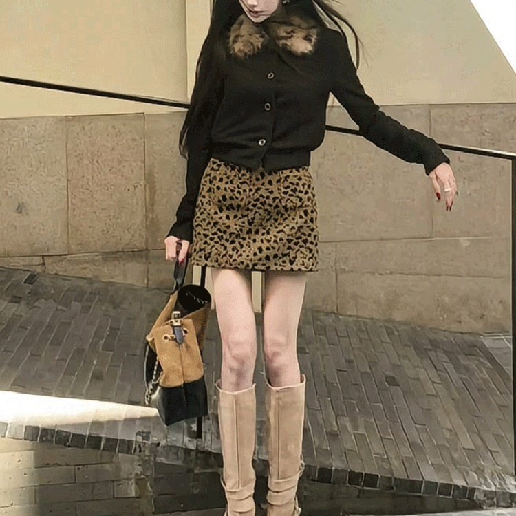 首页> 女装> 2025秋冬新款美式复古黑色毛领短外套针织上衣+豹纹a字短裙两件套