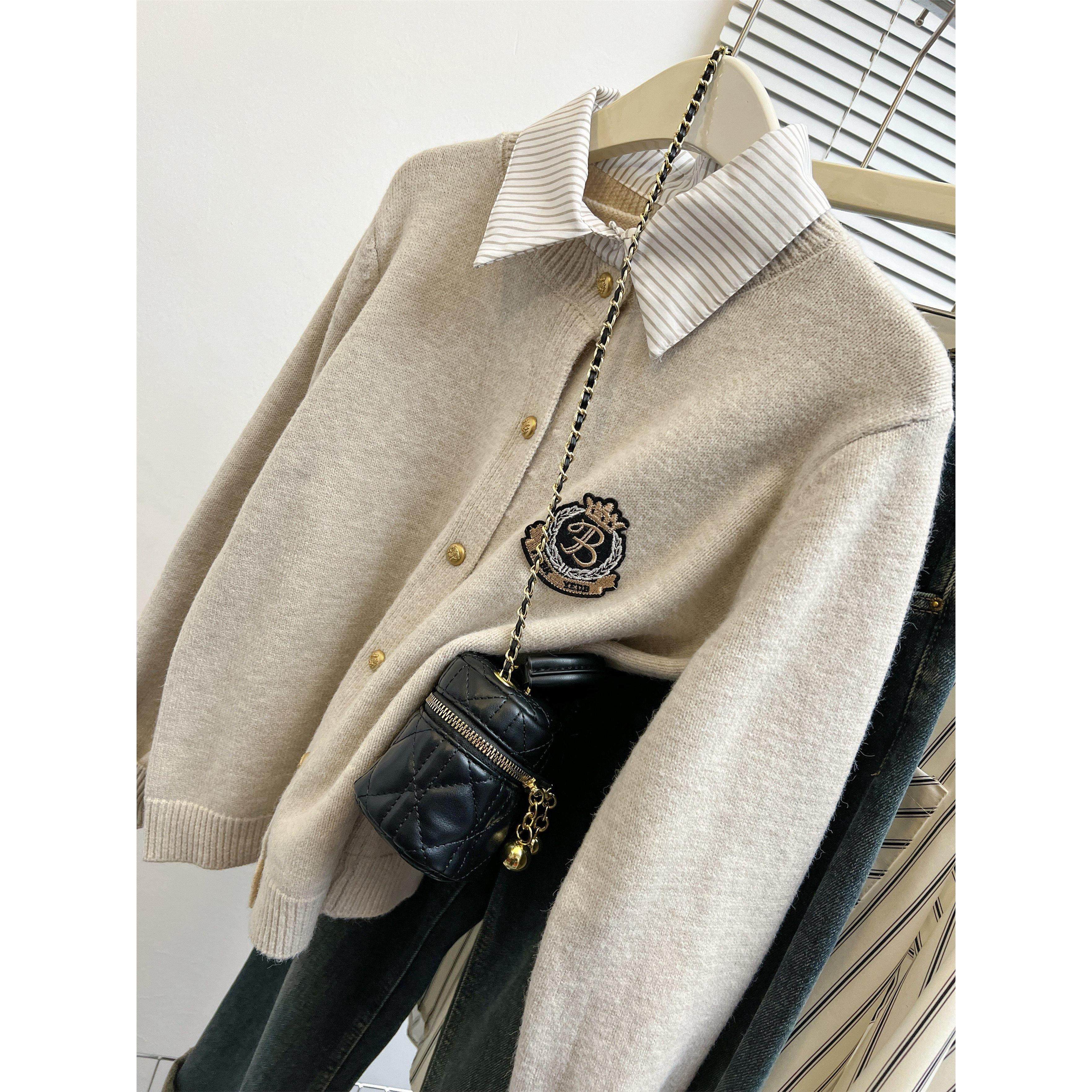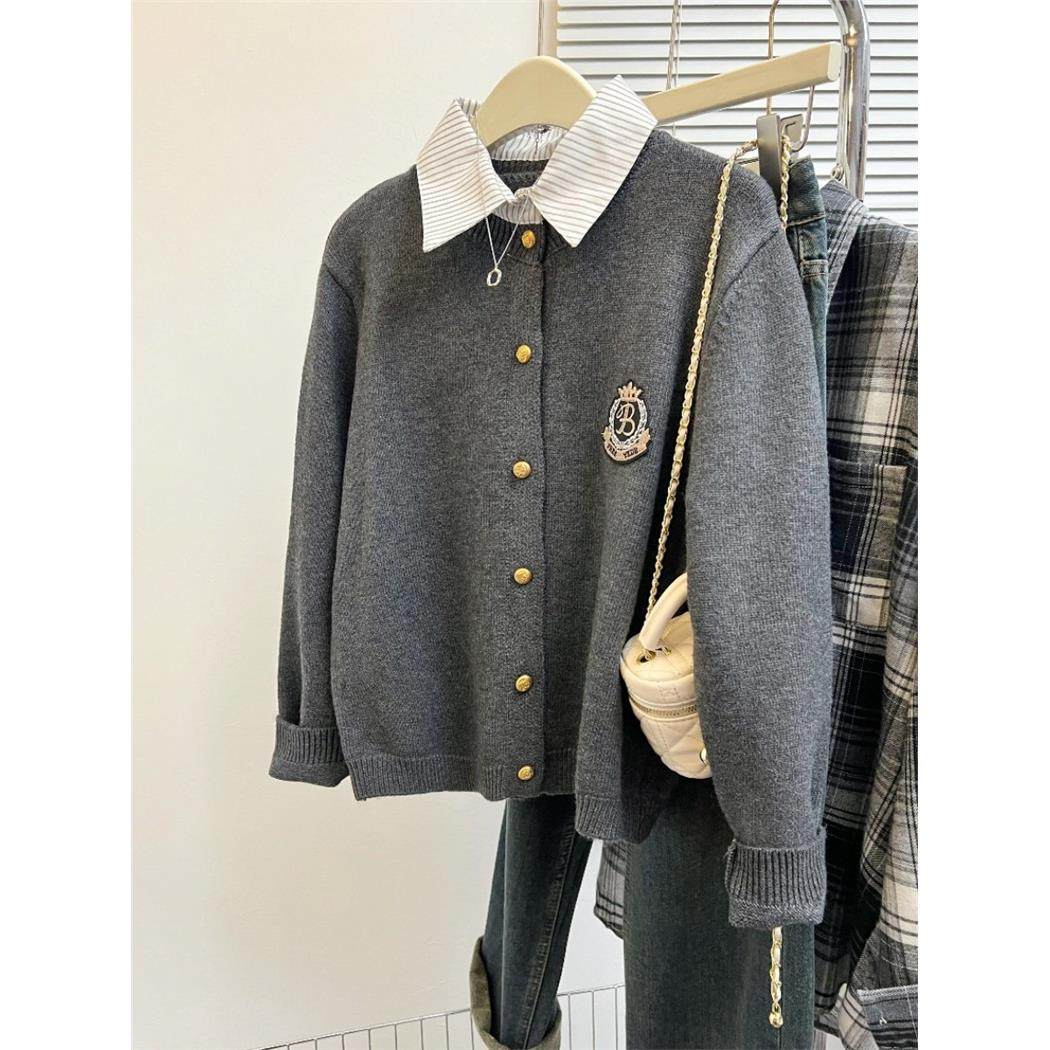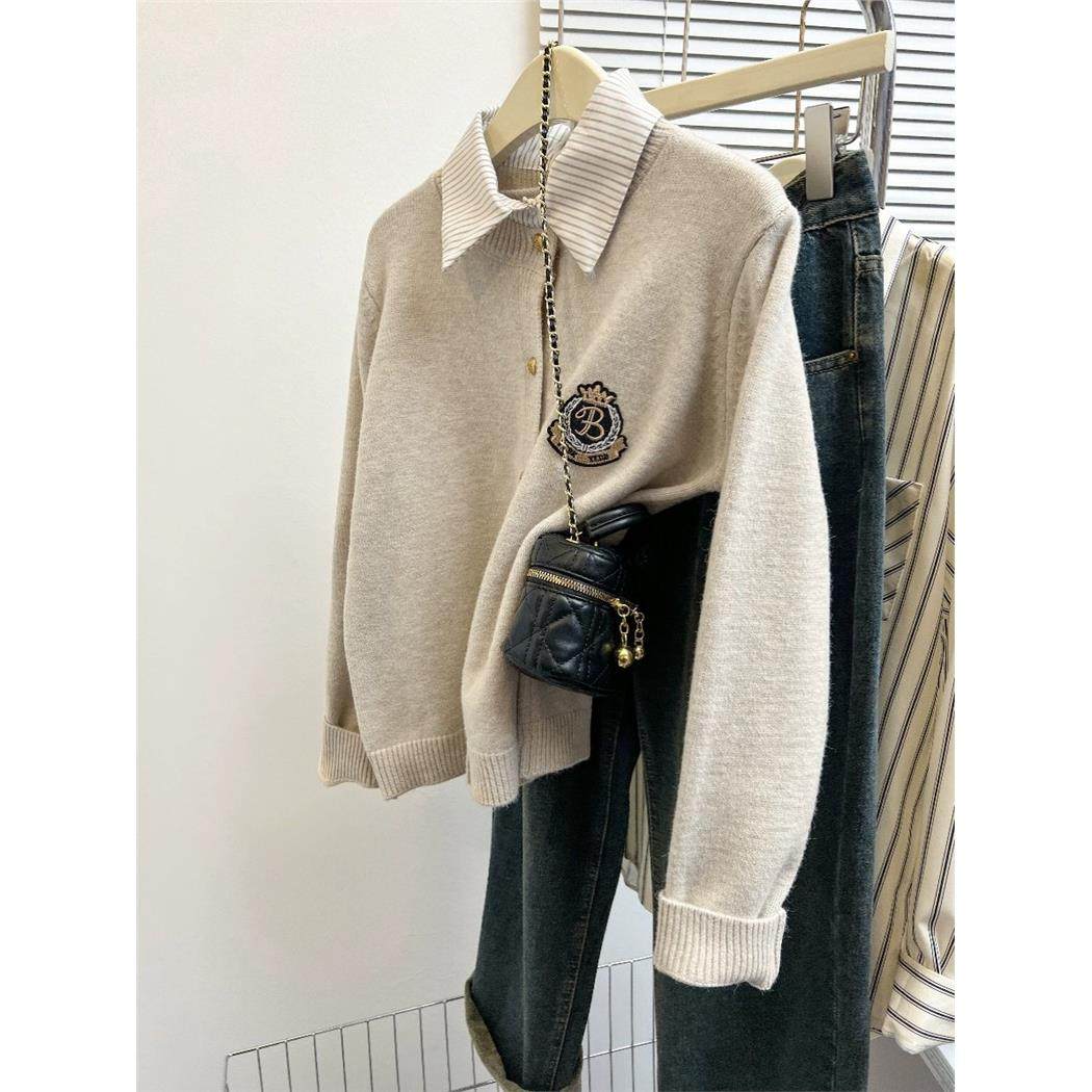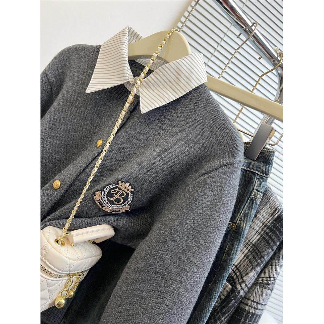 假两件针织衫女春秋小个子外搭衬衫领灰色毛衣开衫外套学院风上衣