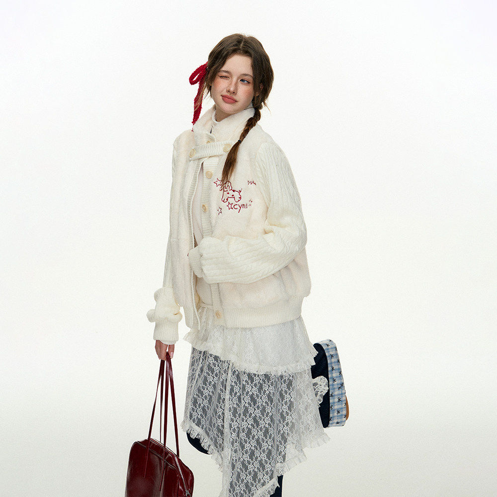 CyNi 甜美针织拼接兔毛外套上衣夹棉开 衫加绒加厚2024冬软糯温柔
