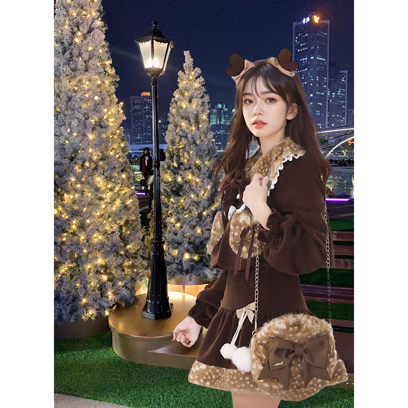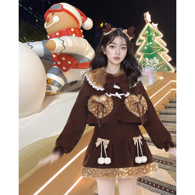 2025冬季新款甜美森系洛丽塔套装拼接蝴蝶结外套+短款半裙两件套