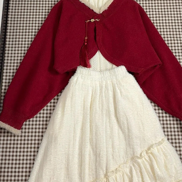 首页> 女装> 复古情书 气质红色短款毛衣+杏色打底衫+不规则半裙设计感三件套