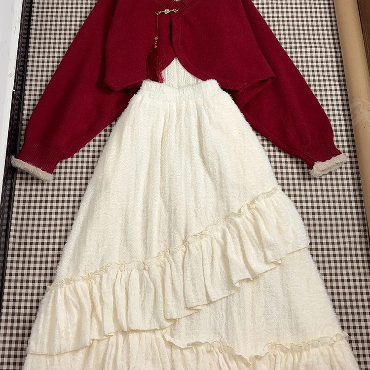 复古情书 气质红色短款毛衣+杏色打底衫+不规则半裙设计感三件套