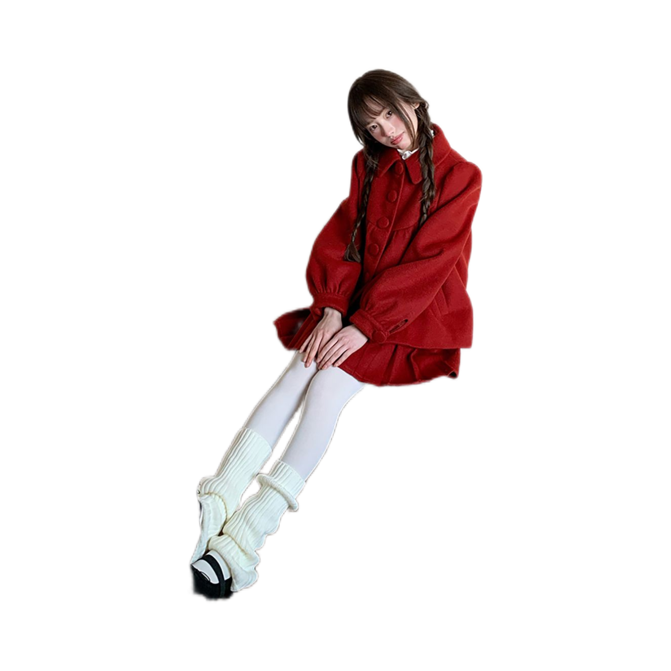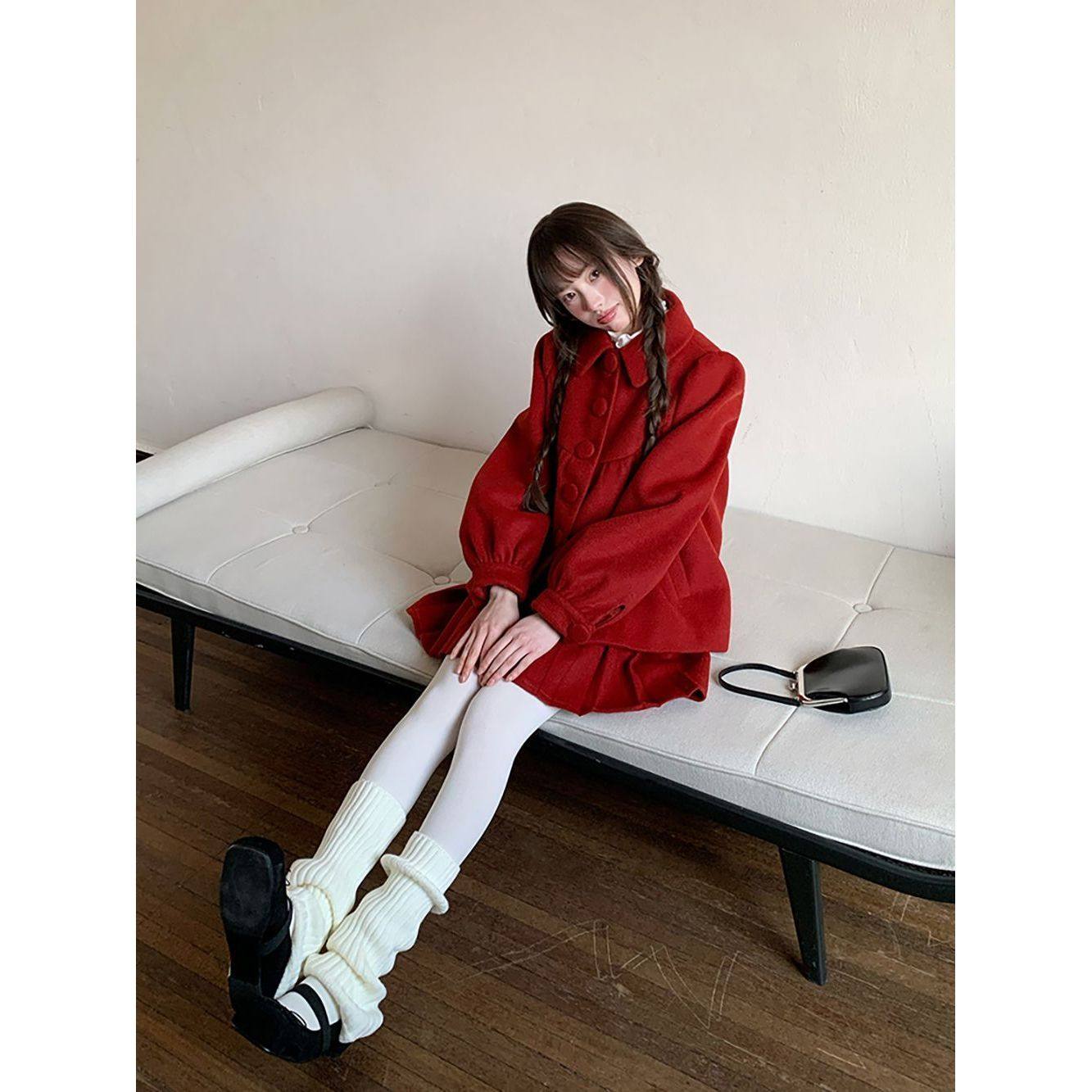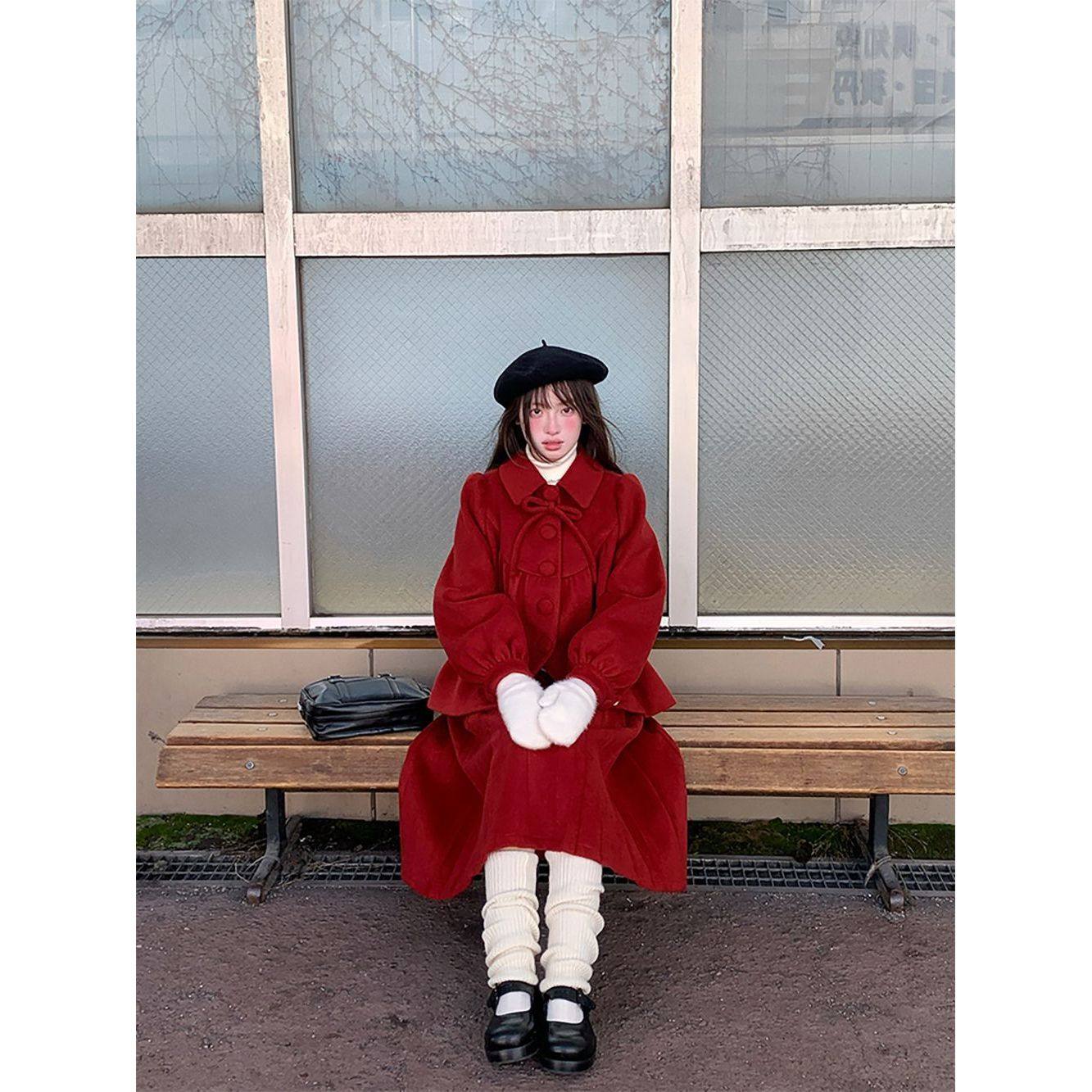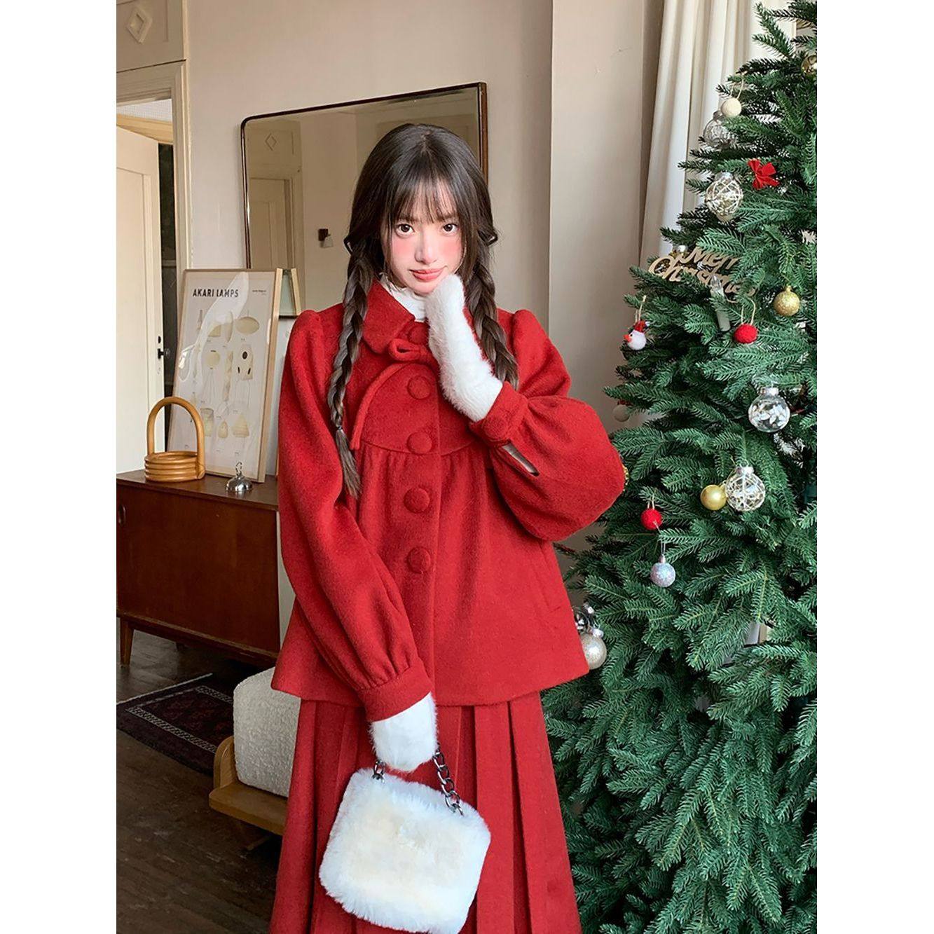 红色新年战袍甜美套装娃娃领蝴蝶结千金大小姐毛呢外套半裙两件套