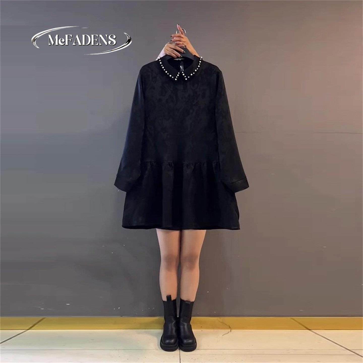 首页> 女装> 香港大码女装宽松赫本风小黑裙胖妹妹翻领钉珠边收腰长袖连衣裙潮